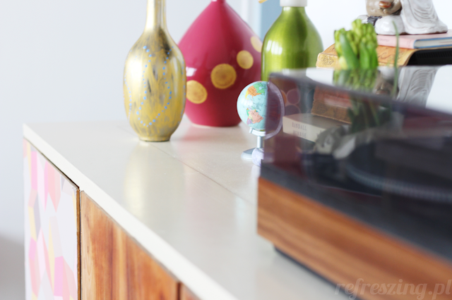 Ubytki w komodzie, po zdjętej nadstawce, zeszlifowałam i uzupełniłam szpachlą akrylową. Ponieważ na blacie widoczna była konstrukcja wspierająca nadstawkę, wiedziałam, że blat i boki pomaluję farbą. Pierwsze drzwi z lewej nawet po zeszlifowaniu, nie wyglądały zbyt cudownie. Zdecydowałam więc, że okleję je tapetą. W świetny, geometryczny, pastelowy wzór. Chciałam by komoda była funky, wesoła, przyjemna. Do kremowej farby na blacie i bokach, pastele z tapety wpasowały się idealnie, zaś by odróżniała się od podłogi, dałam jej biało-złote kopytka. Efekty pozostawiam Waszej surowej ocenie! Ale pamiętajcie, to, że ja mebel pomalowałam na jasny krem i dodałam tapetę, nie znaczy, iż Wy musicie zrobić podobnie. Być zdecydowałybyście tylko zawoskować mebel. Albo pomalować go na indygo? Pokazuję Wam po prostu, co można uzyskać z takiego mebla. Więc pędzle w dłoń!