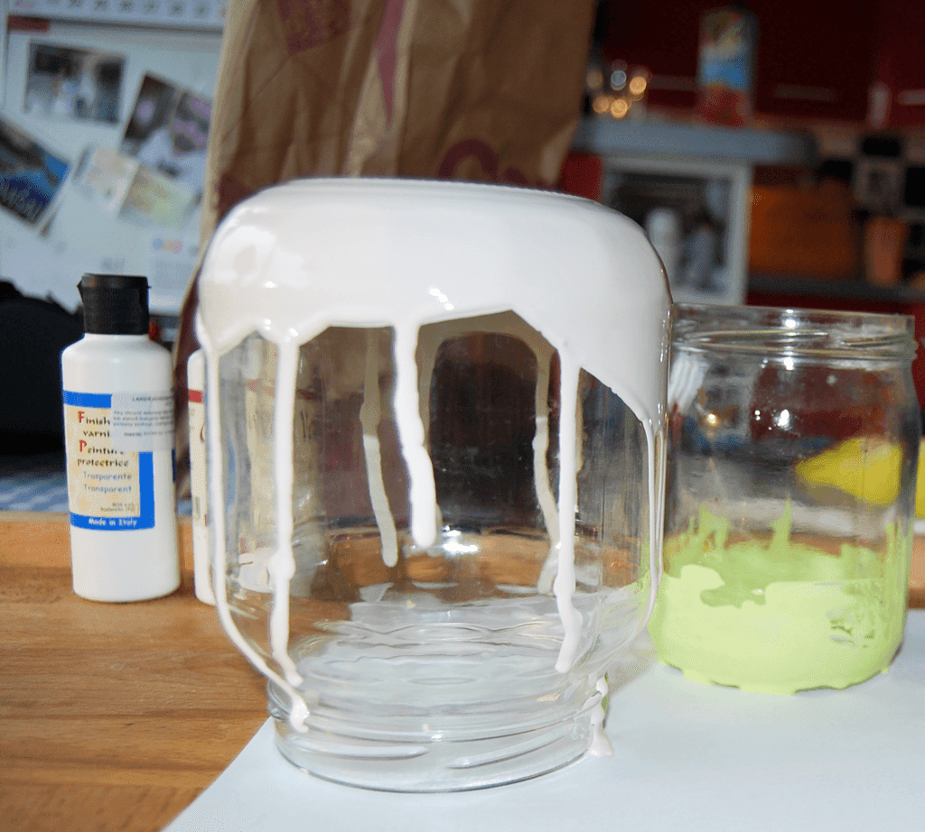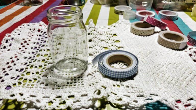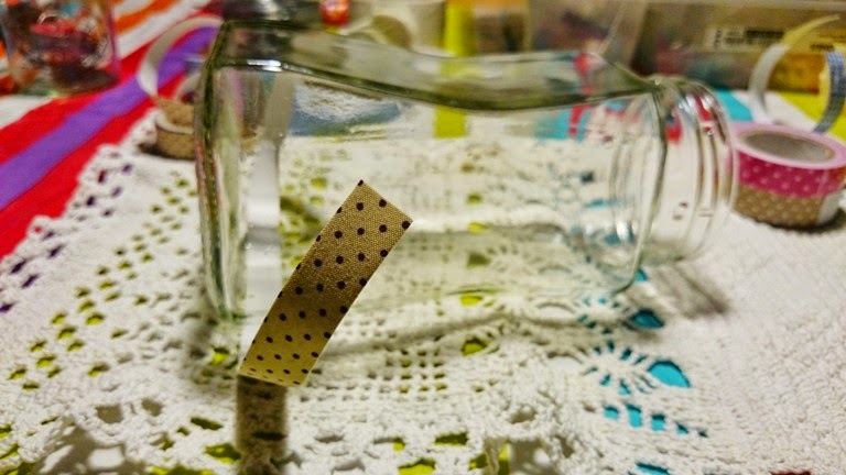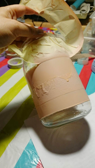 Spray’owanie. Obklejcie słoiczki taśmą celem uzyskania pasów lub pasem do pończoch w zależności od pożądanego efektu.