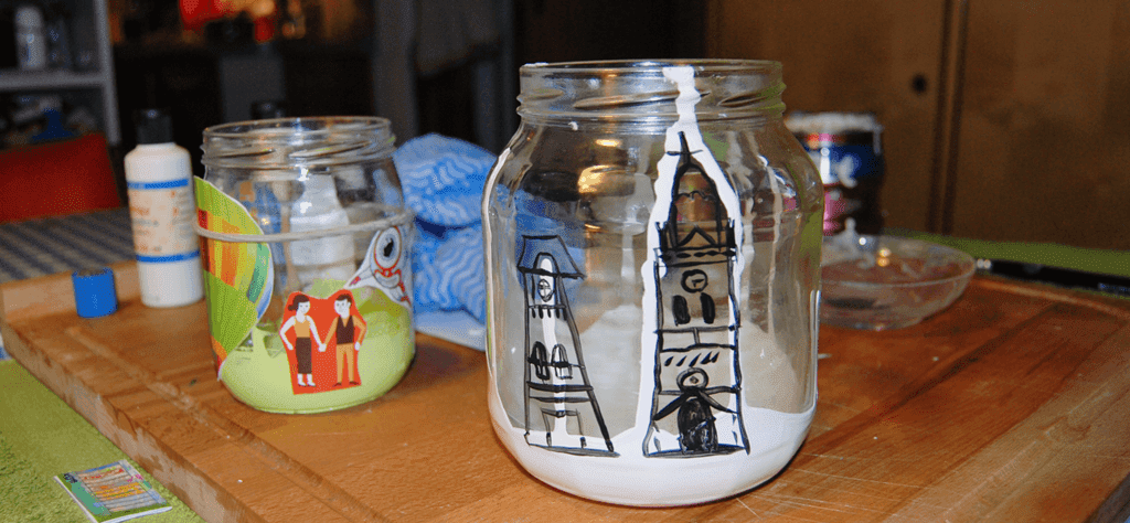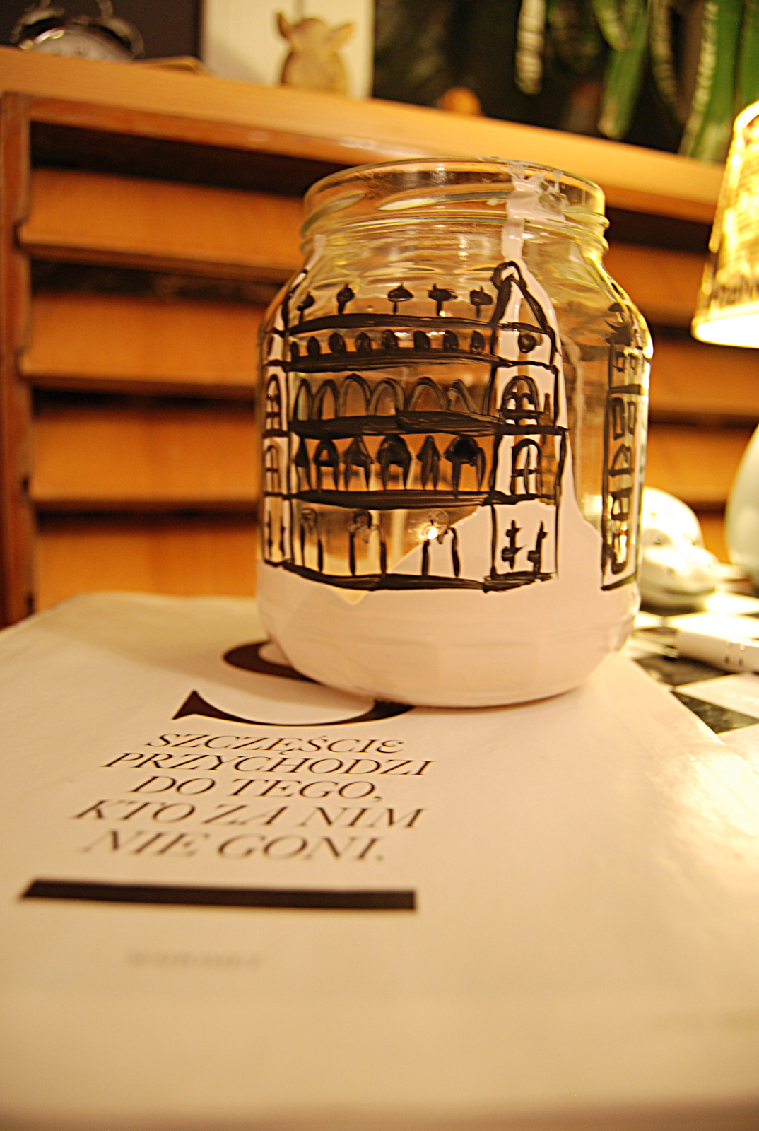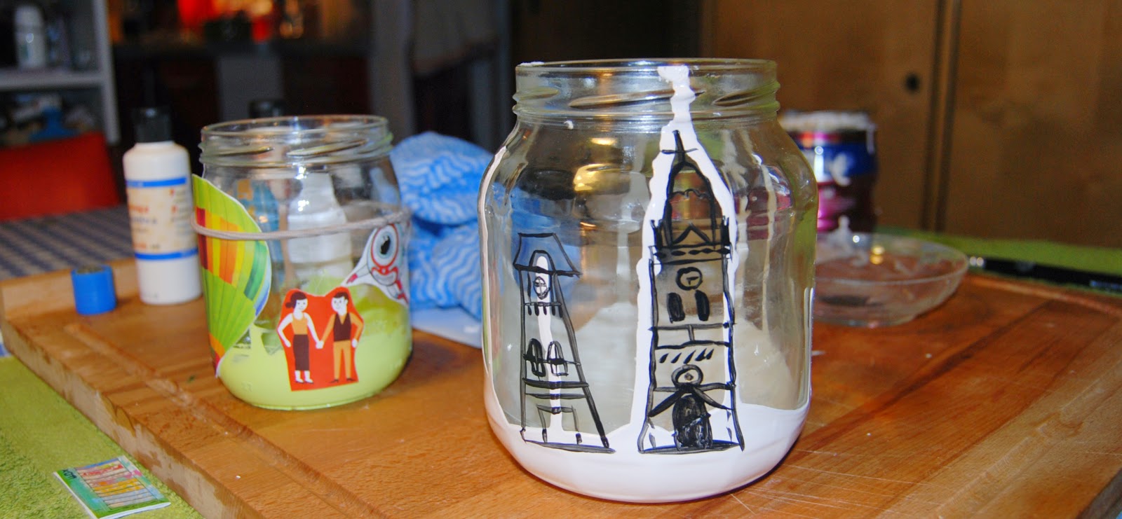 Od razu wyjaśnię o co mi chodziło. Zamysł był taki, aby namalować w infantylny sposób budynki (fronty Łódzkich kamienic, budynek fabryczny z kominami, cerkwie) jako symbole mojego Miasta. Drugi słoiczek to już swoistego rodzaju abstrakcja, nierówne groszkowe tło i kolorowe wycinanki.