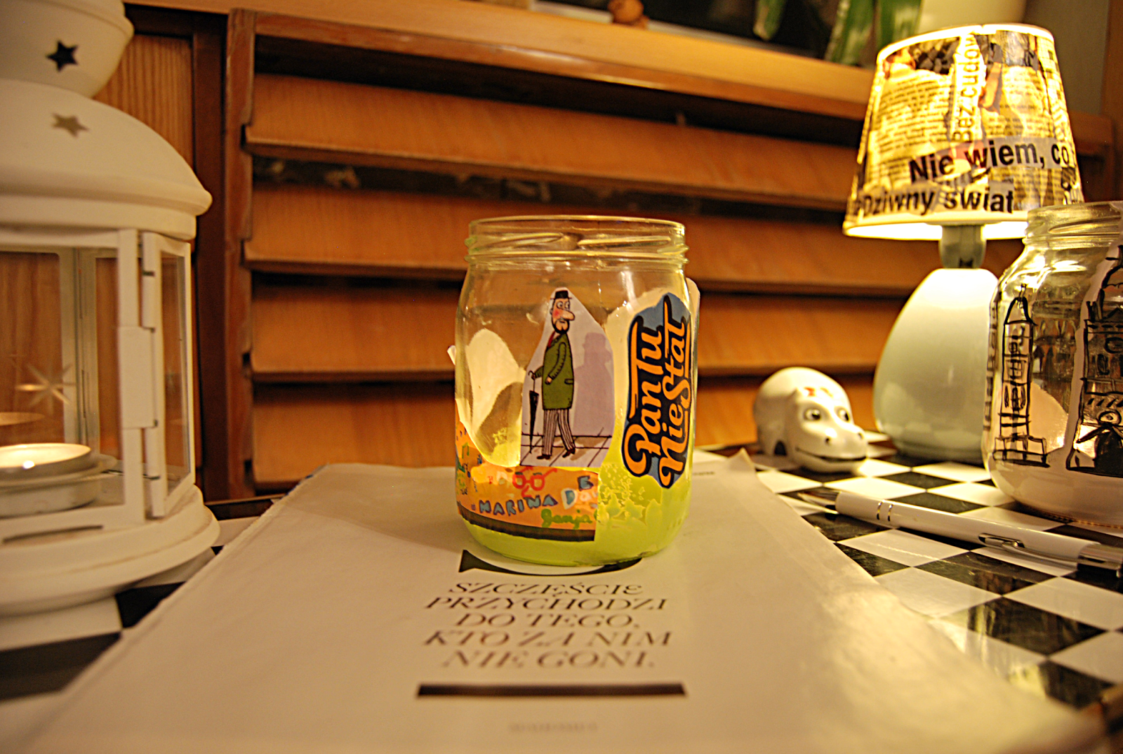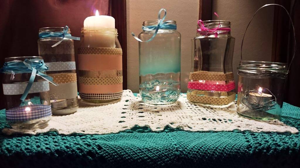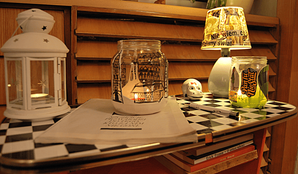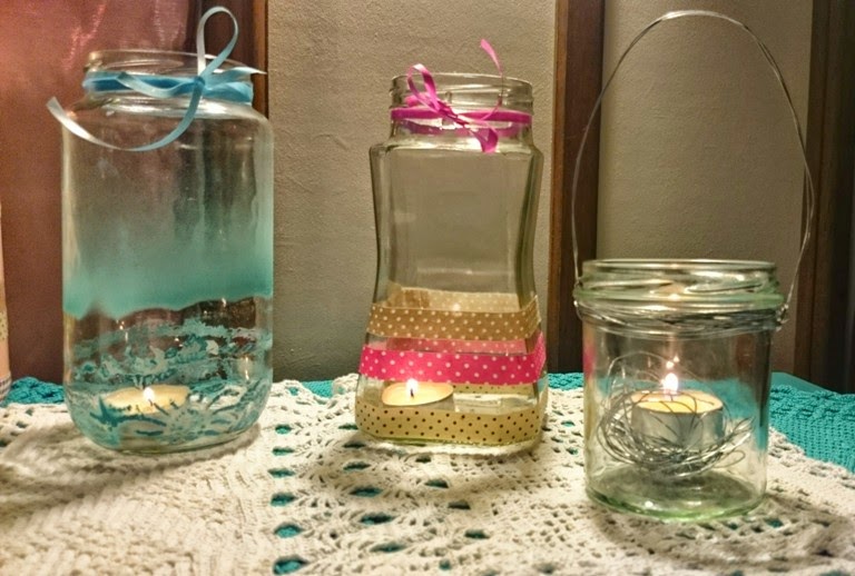 Ile słoików tyle pomysłów. Zamiast biec po zwykłe lampiony- których jak widać też używam- warto wnieść trochę twórczej inwencji. I mieć coś swojego. W tak ozdobionych słoiczkach można przechowywać również długopisy, sztućce na stole, a także nalać do nich wody i traktować jako ozdobne wazoniki;)
