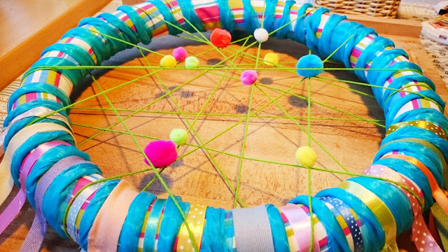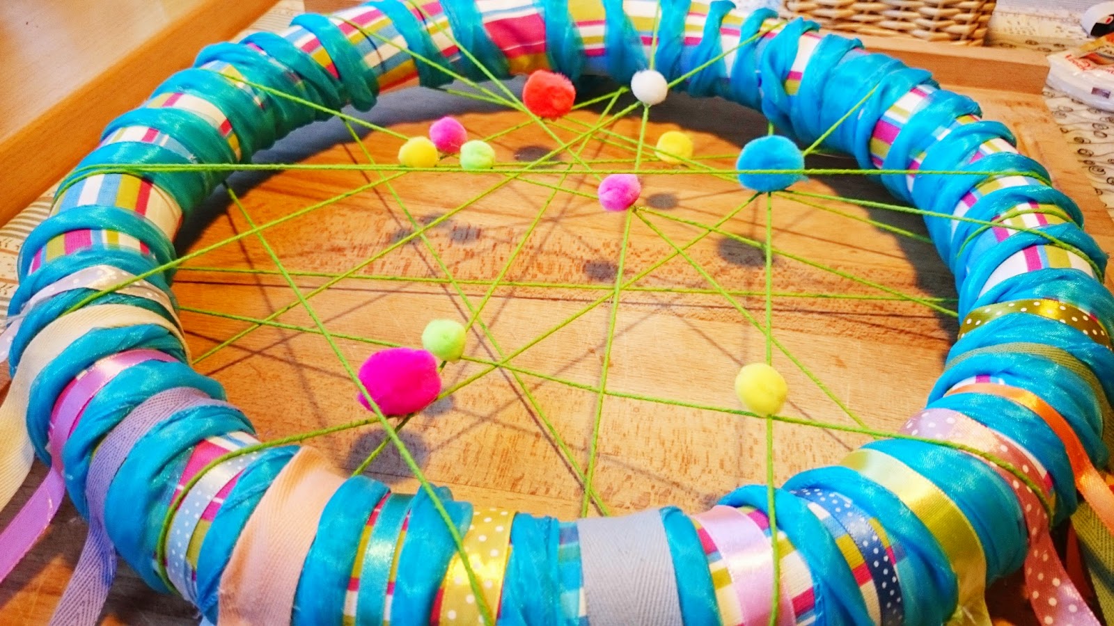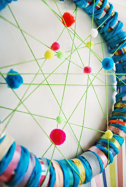 Tak, wiem, na tym etapie, osoby nie przepadające za kolorem są już mocno poddenerwowane, możecie więc swobodnie uciekać 🙂 Będzie tylko więcej! Jak prawdziwy łapacz, mój DIY także musi mieć w środku pajęczynę. Ale nie taką idealną, wyuzdaną. Dorwałam więc zwykły sznurek, akuratnie zielony, którym wyplotłam, niczym Tekla, wzór w środku. Wyglądał jednak dość smutno. I wpadłam na pomysł! Pompony:)