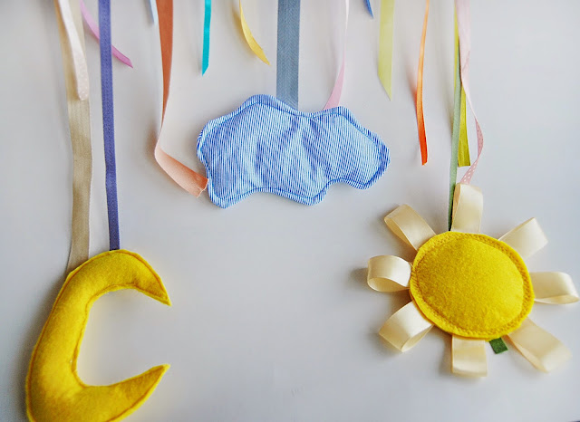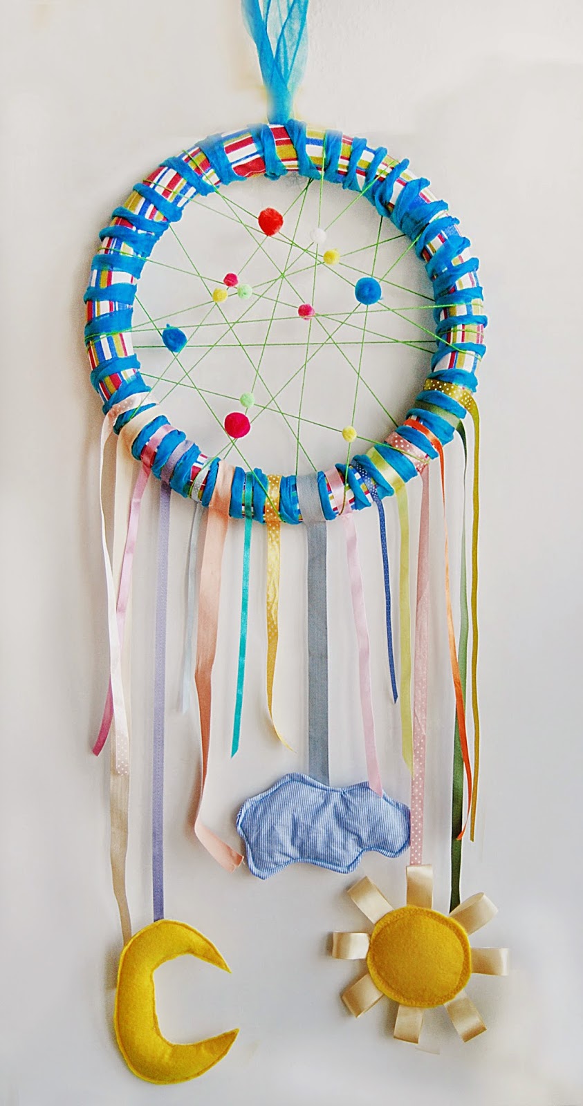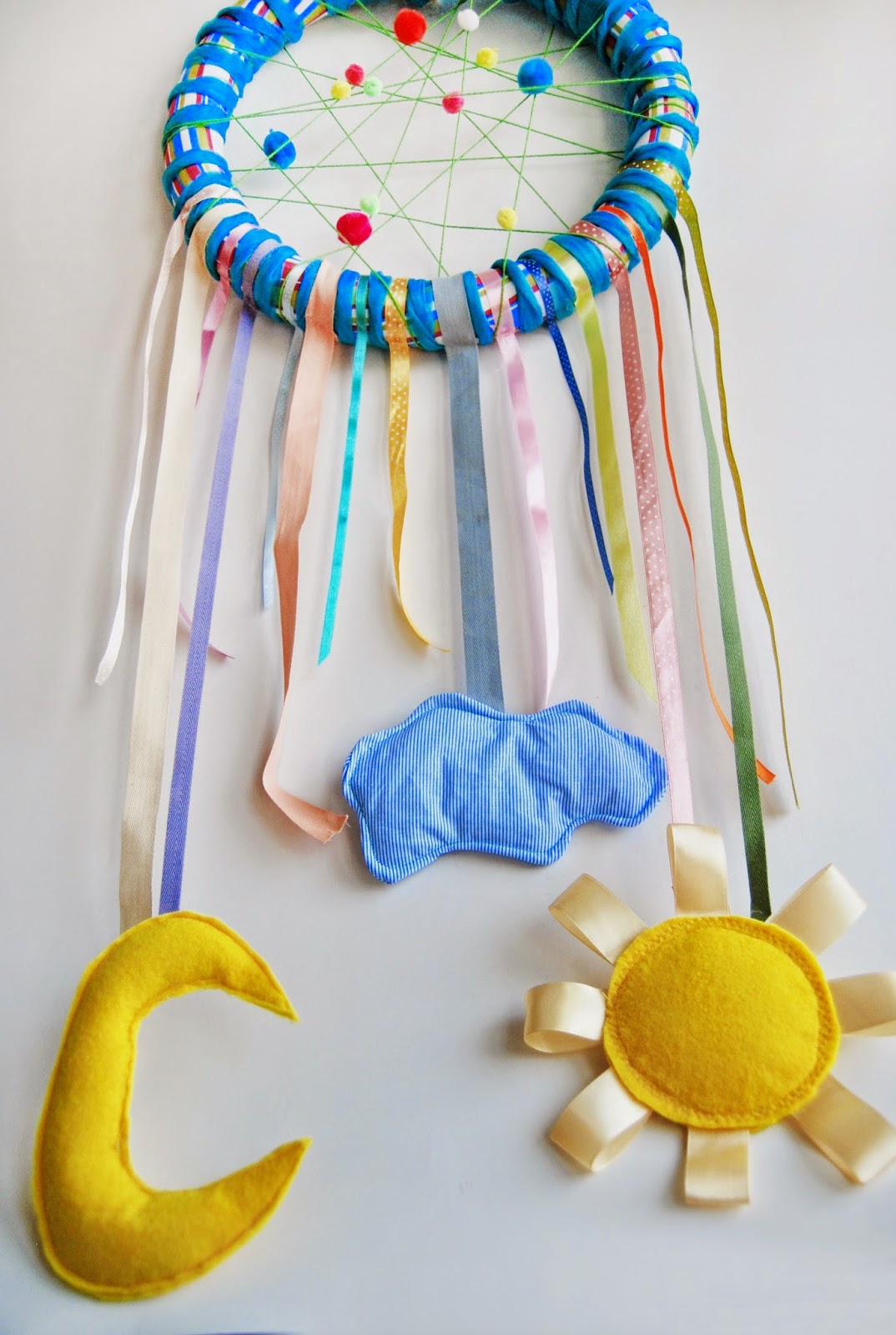 I właściwie mogę już swój łapacz snów / dreamcatcher pokazać w pełnej okazałości, dodając trzy cudne filcowe wisiory, wykonane przez moją siostrę (dwarazyosiem): Słońce, Księżyc i Chmurka: