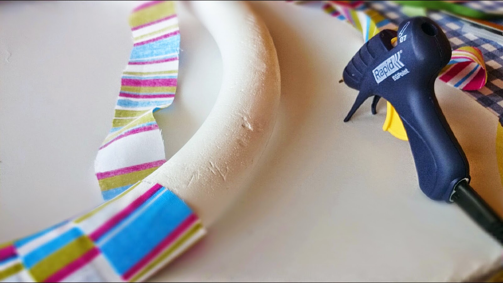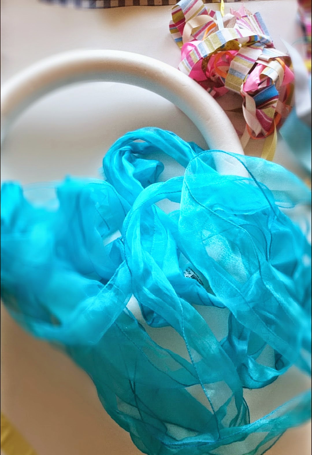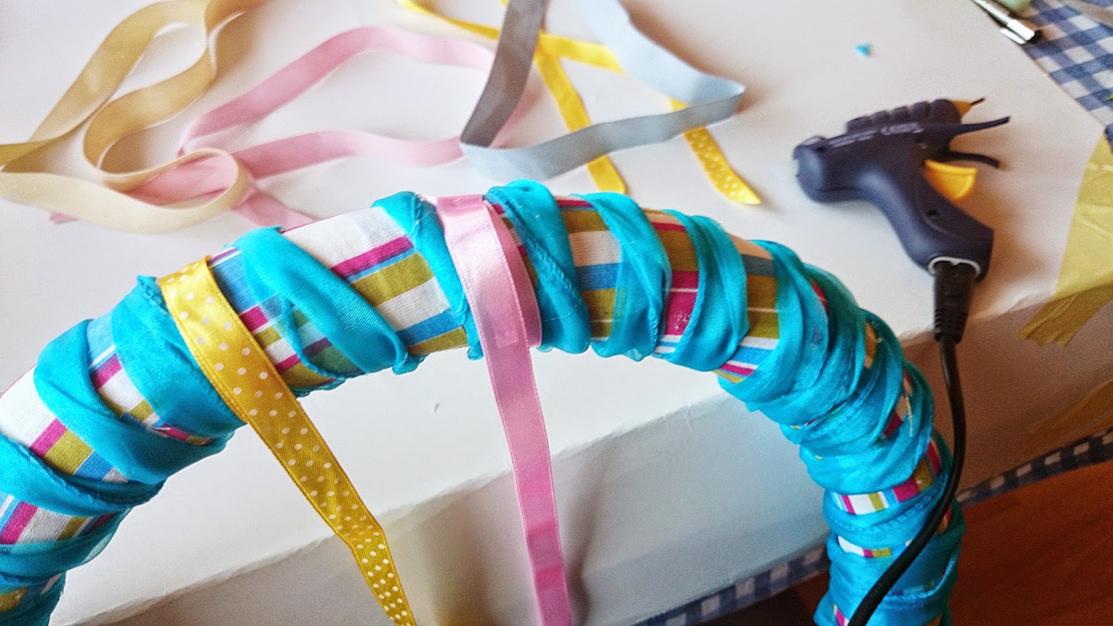 Tkanina. Także resztki Pocięta na 2-3cm paski,którą przy użyciu pistoletu obkleiłam cały ring. Później w ruch poszedł sznur z organzy, również z bukietu. Pasowała mi jego niebieskość do pasków na już przyklejonej tkaninie. Ale do tego musiałam dodać oczywiście jeszcze więcej koloru, więc wrażliwi muszą uważać 🙂 :