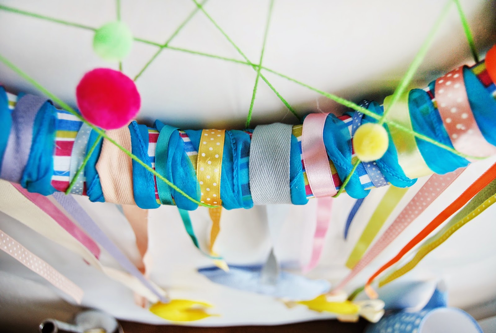 Niezastąpiony pistolet z klejem posłużył do przymocowania uroczych, kolorowych, różnej wielkości pomponów do bawełnianego sznurka: