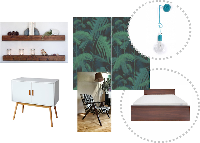 Wpis zaczęłam od tego, że pomysł na sypialnię był spontaniczny. Otóż wcale nie. Kilkanaście tygodni temu na blogu Kasi, w jej Piątym Pokoju (klik), natrafiłam na moodboard, z którego tapeta musiała zostać mi w głowie. I tak kilka dni temu – kompletnie zapomniawszy o wpisie Kasi, siedziałam pół nocy z tabletem szukając tapety pod hasłami: dżungla, tropiki, wieczorowy las tropikalny 🙂 Szlag mnie trafiał, bo coś w głowie dzwoniło, ale w którym kościele? I nagle taki flashback- widziałam to u Kasi. Jakaż była moja radość, kiedy finalnie na jej blogu, odkopałam ten wpis, znalazłam tapetę,w dodatku ze źródłem (!DZIĘKI!) i namierzyłam Polską firmę, z Łodzi, która dystrybuuje cuda marki Cole&Son, z kolekcji Contemporary Restyled.