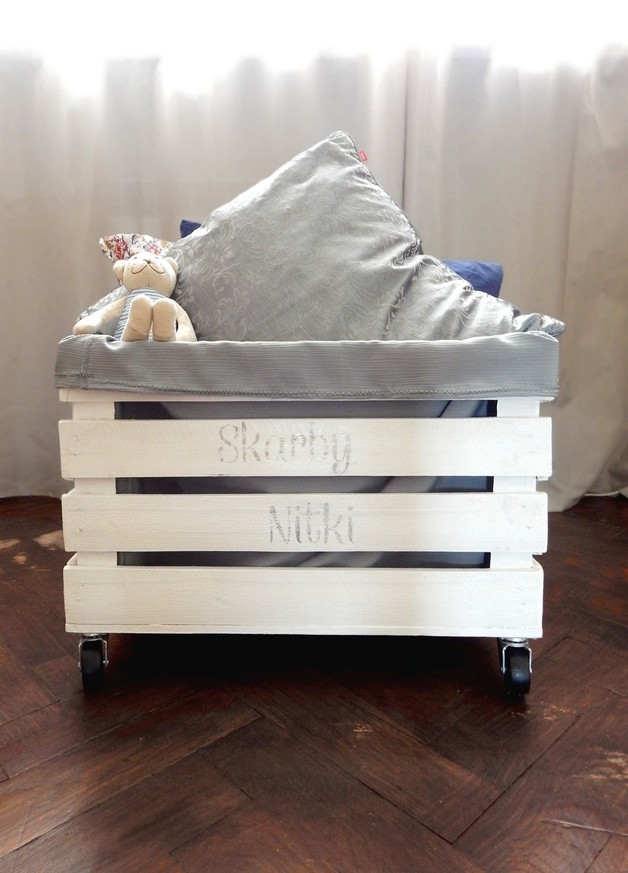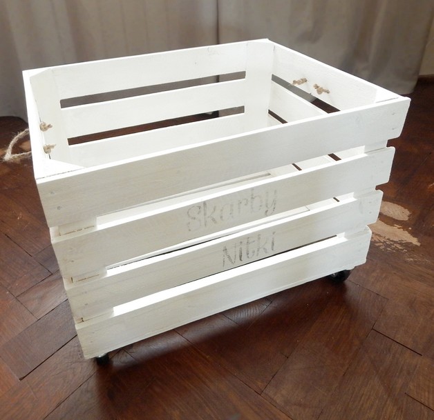 Karolina tworzy skrzynie ze starych, wysuszonych desek. Są wyszlifowane, malowane bezpieczną farbą akrylową i zabezpieczone bezbarwnym woskiem. Kółka wykonane są ze sztucznego tworzywa. Na skrzynie może znaleźć się napis/grafika.