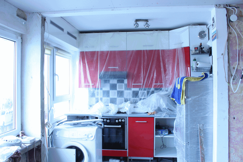 Wymagało to usunięcia kawałka ściany, całkowitej przebudowy szafki rogowej. Na gifie, w prawej części, widać białą ściankę i po usunięciu z zaciągniętą zaprawą: