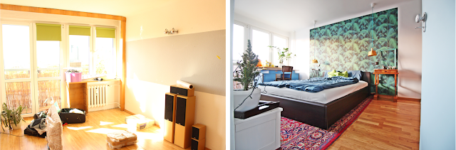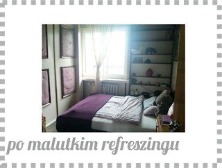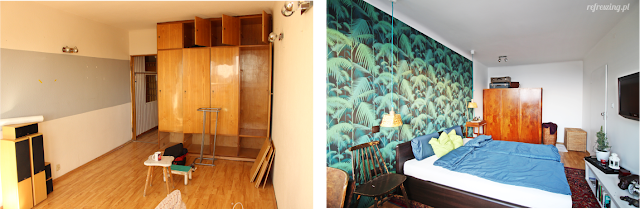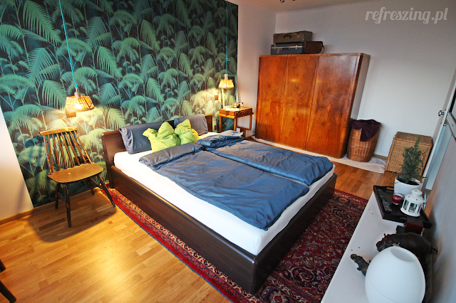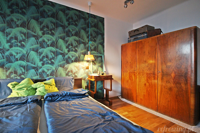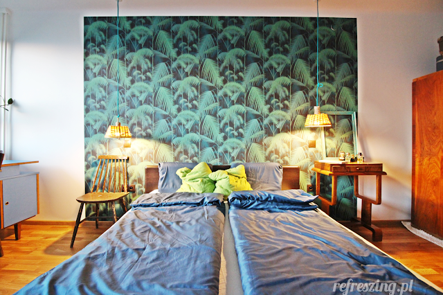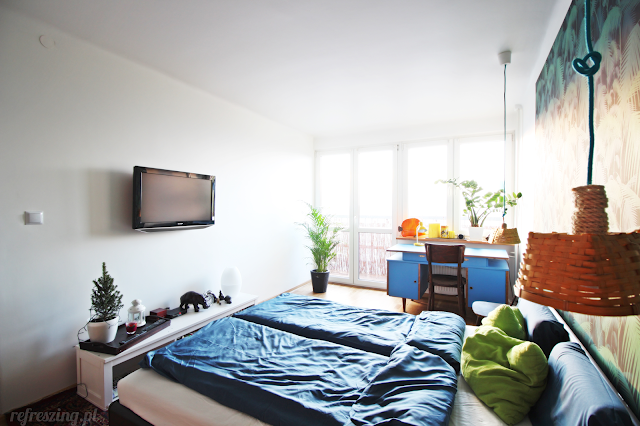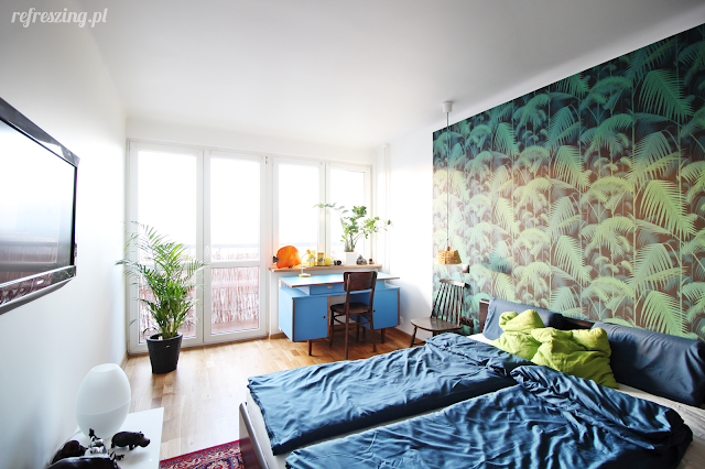 To z czego bardzo się cieszę,to meble. Poza łóżkiem, wszystkie są drewniane. A taki cel sobie postawiłam, tworząc wyposażenie mieszkania, przebierając w swoich zasobach magazynowych. Ramę z czasem wymienimy na drewnianą. Póki co, ciemny brąz nie zaburza samej ściany z tapetą. W pokoju widzicie szafę,którą zdobyłam dzięki Justynie, właściwie dwóm. Jedna, moja przyjaciółka, podała mi namiar na swoją koleżankę, która opróżniała mieszkanie po Babci. Uwielbiam tą szafę, służyła mi wcześniej w pracowni, a teraz jest naszym centrum ciuchowego dowodzenia. Pięknie też pasuje do stoliczka nocnego z „mojej strony łóżka”. Jedyne, co chcemy w niej zmienić to dać tapetę- do środka, a także jakieś nóżki. Sprawa na później. Jakiś lifting przejdzie;) Po stronie M. póki, co stoi patyczak. Obdrapany, zdobyty podczas kupowania biurka. Z czasem „stoliczki nocne” będą się pewnie zmieniały. Czekają na mnie w pracowni jedne takie. Zobaczymy. Z biurka jestem mega dumna, jego pełen refreszing z kilkoma smaczkami w środku zobaczycie na blogu niedługo. A jaki widok zza tego biurka. Miodzio:) Cieszę się z zielonych roślinek, które uzupełniają tą przestrzeń. Nie tylko dlatego, że na ścianie znajduje się tapeta z motywem roślinnym. Przy drewnie na podłodze i białych ścianach, kwiaty po prostu wspaniale kontrastują. Chce się więcej. Przy biurku krzesło od mojej Mamy. Zostaje takie, nie ruszone. Może kiedyś je lekko przeszlifuję i zawoskuję, celem odświeżenia:) Tfu,zrefreszingowania!