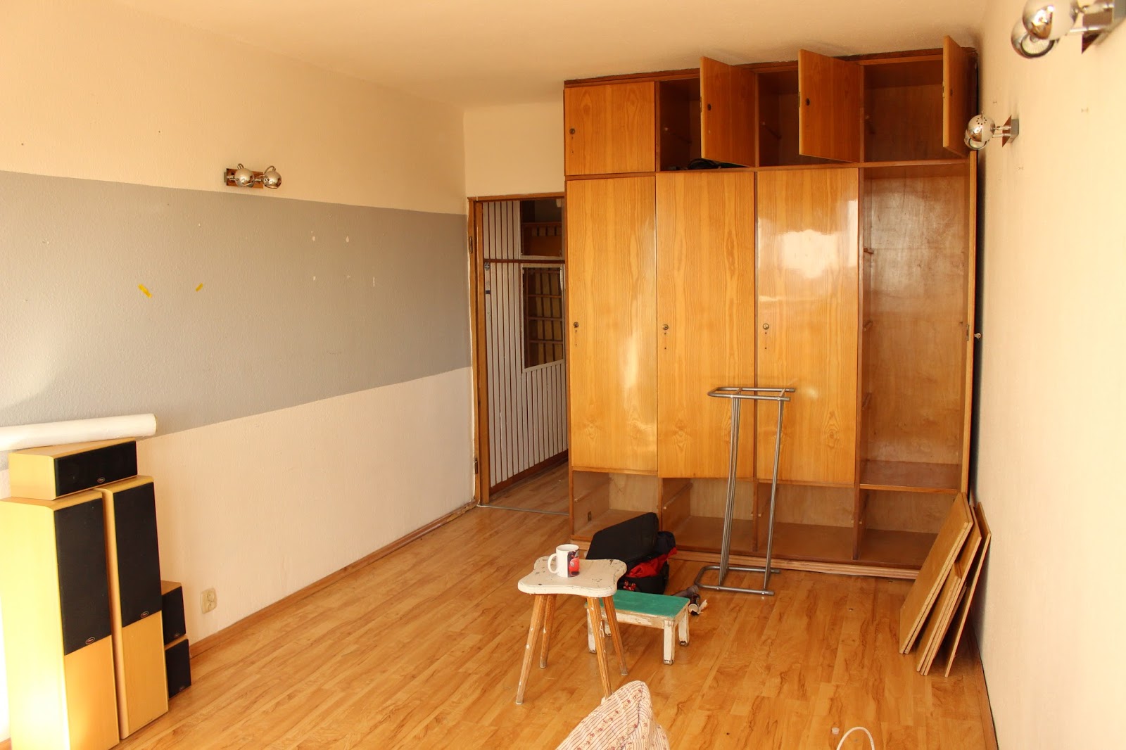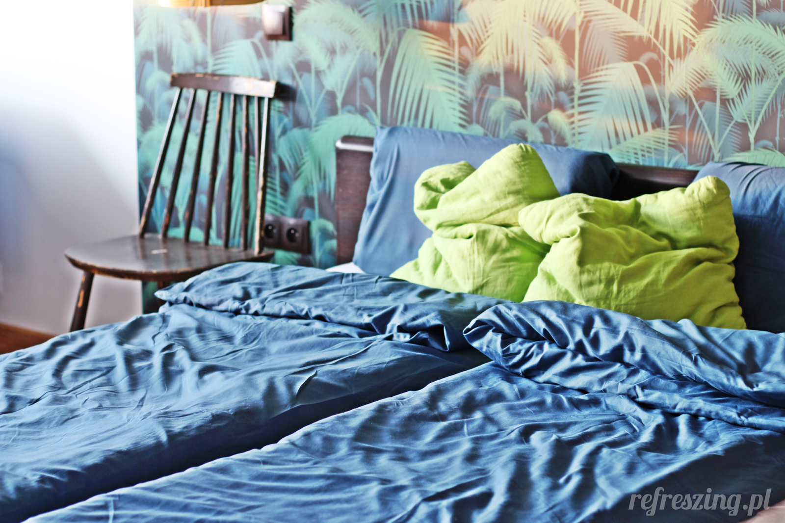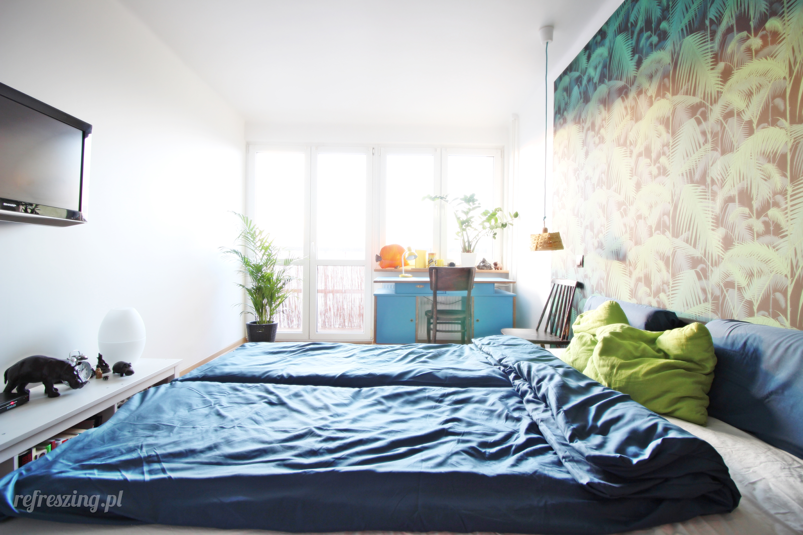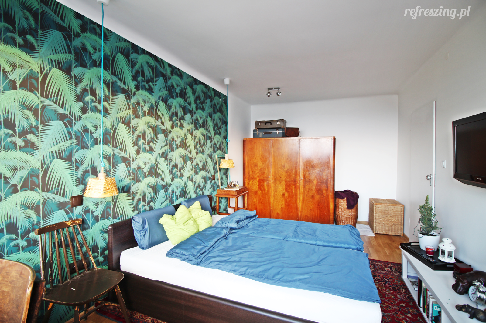 To z czego bardzo się cieszę,to meble. Poza łóżkiem, wszystkie są drewniane. A taki cel sobie postawiłam, tworząc wyposażenie mieszkania, przebierając w swoich zasobach magazynowych. Ramę z czasem wymienimy na drewnianą. Póki co, ciemny brąz nie zaburza samej ściany z tapetą. W pokoju widzicie szafę,którą zdobyłam dzięki Justynie, właściwie dwóm. Jedna, moja przyjaciółka, podała mi namiar na swoją koleżankę, która opróżniała mieszkanie po Babci. Uwielbiam tą szafę, służyła mi wcześniej w pracowni, a teraz jest naszym centrum ciuchowego dowodzenia. Pięknie też pasuje do stoliczka nocnego z „mojej strony łóżka”. Jedyne, co chcemy w niej zmienić to dać tapetę- do środka, a także jakieś nóżki. Sprawa na później. Jakiś lifting przejdzie;) Po stronie M. póki, co stoi patyczak. Obdrapany, zdobyty podczas kupowania biurka. Z czasem „stoliczki nocne” będą się pewnie zmieniały. Czekają na mnie w pracowni jedne takie. Zobaczymy. Z biurka jestem mega dumna, jego pełen refreszing z kilkoma smaczkami w środku zobaczycie na blogu niedługo. A jaki widok zza tego biurka. Miodzio:) Cieszę się z zielonych roślinek, które uzupełniają tą przestrzeń. Nie tylko dlatego, że na ścianie znajduje się tapeta z motywem roślinnym. Przy drewnie na podłodze i białych ścianach, kwiaty po prostu wspaniale kontrastują. Chce się więcej. Przy biurku krzesło od mojej Mamy. Zostaje takie, nie ruszone. Może kiedyś je lekko przeszlifuję i zawoskuję, celem odświeżenia:) Tfu,zrefreszingowania!