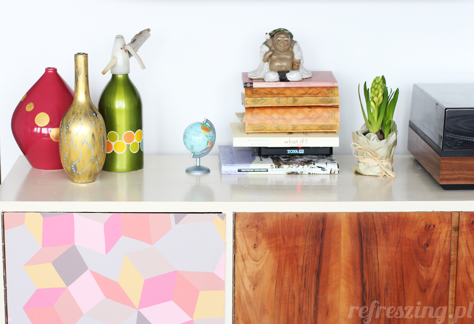 Ubytki w komodzie, po zdjętej nadstawce, zeszlifowałam i uzupełniłam szpachlą akrylową. Ponieważ na blacie widoczna była konstrukcja wspierająca nadstawkę, wiedziałam, że blat i boki pomaluję farbą. Pierwsze drzwi z lewej nawet po zeszlifowaniu, nie wyglądały zbyt cudownie. Zdecydowałam więc, że okleję je tapetą. W świetny, geometryczny, pastelowy wzór. Chciałam by komoda była funky, wesoła, przyjemna. Do kremowej farby na blacie i bokach, pastele z tapety wpasowały się idealnie, zaś by odróżniała się od podłogi, dałam jej biało-złote kopytka. Efekty pozostawiam Waszej surowej ocenie! Ale pamiętajcie, to, że ja mebel pomalowałam na jasny krem i dodałam tapetę, nie znaczy, iż Wy musicie zrobić podobnie. Być zdecydowałybyście tylko zawoskować mebel. Albo pomalować go na indygo? Pokazuję Wam po prostu, co można uzyskać z takiego mebla. Więc pędzle w dłoń!