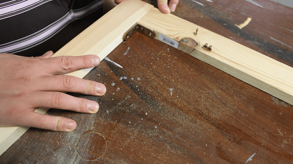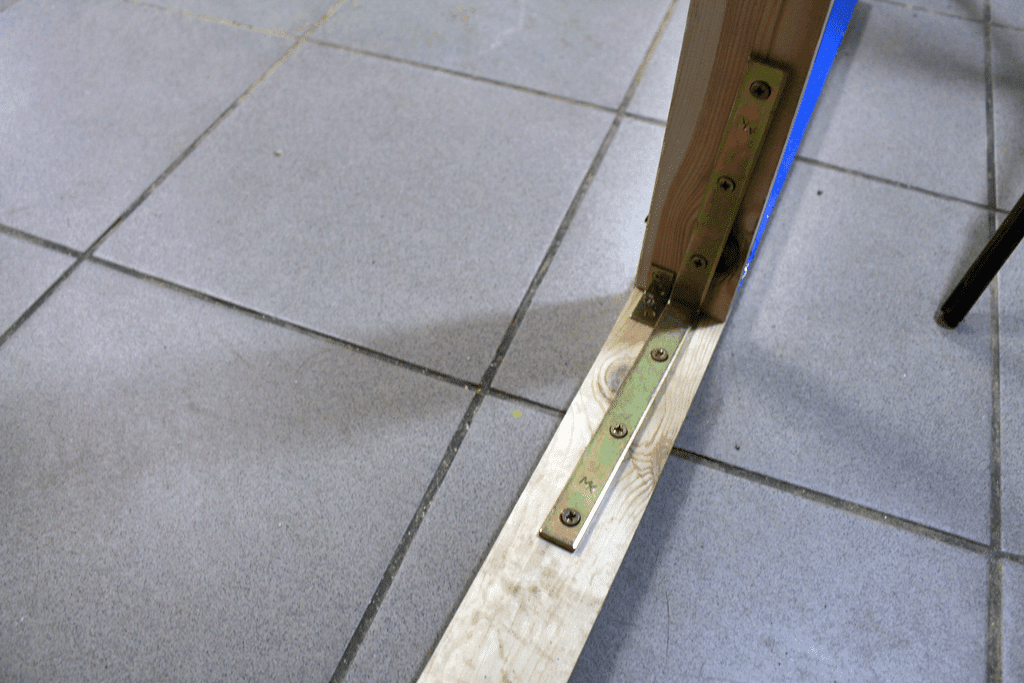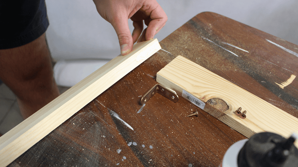 My użyliśmy wyrzynarki, bo mamy ją na stanie. Ale jeśli jej nie posiadacie, wykonajcie tą usługę w markecie budowlanym. Znajdziecie w nim różne kantówki, mam na myśli przekrój. My zdecydowaliśmy się na takie,wyglądające, jak małe deski, wybór należy do Was. Od wyboru kantówek, zależeć będzie, jakie dobierzecie do nich metalowe kątowniki i złączki. Gotowe elementy ramy możemy skręcić mniejszymi kątownikami. Pamiętajcie, przed skręceniem podkleić obydwa elementy.
