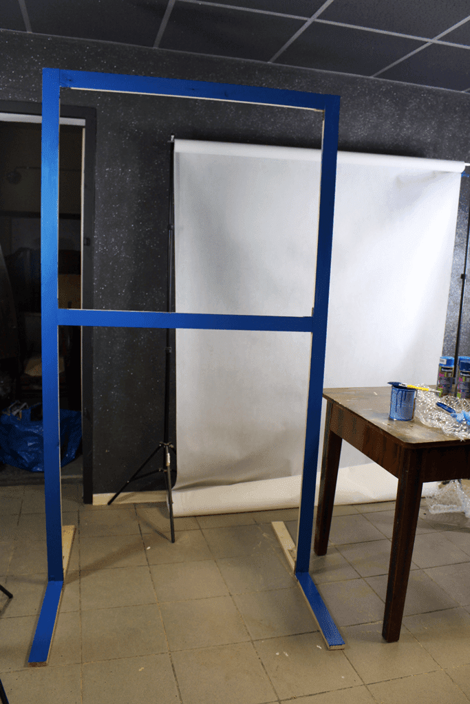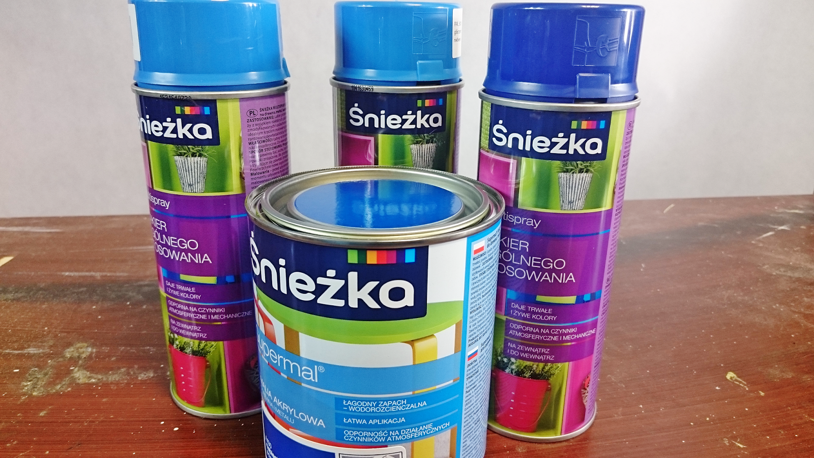 Do wykonania fotobudki wystarczyła jedna warstwa emalii akrylowej Supermal Śnieżka, aby uzyskać tak intensywny kolor, A430 niebieski, (wow!), a na farbę położyliśmy