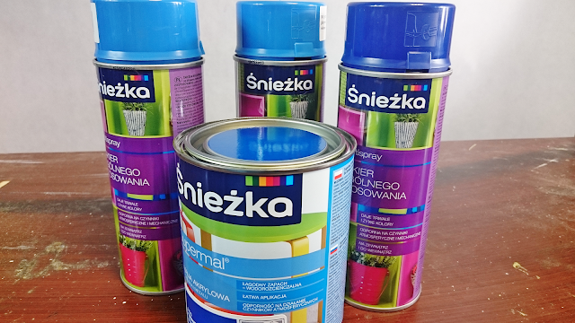 Stelaż gotowy, czas na malowanie! Jeśli chodzi o farbę do pomalowania i udekorowania naszej fotobudki wybrałam sprawdzone farby akrylowe. Supermal Śnieżki, dostępny jest w cudnych kolorach. Ja zdecydowałam się na piękny niebieski (A430) i dobrałam do niego Multispraye w kolorze granatowym i niebieskim .