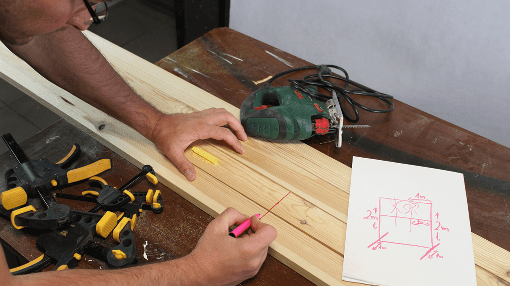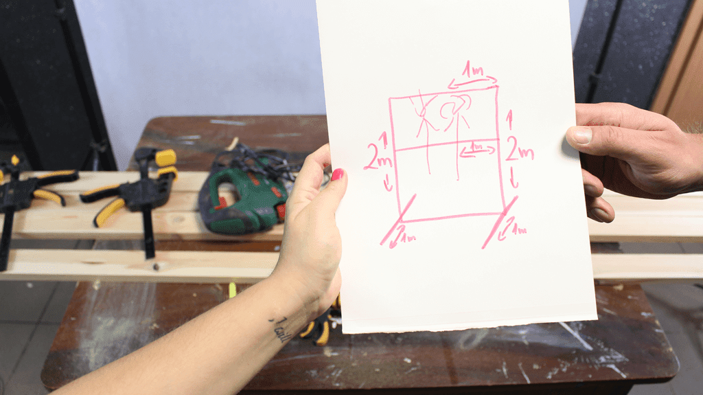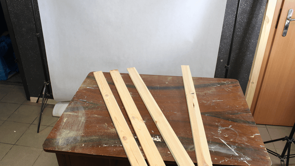 Najważniejszy jest projekt. Nasz, jak widać, pełna profeska. W skrócie: dwie dwumetrowe kantówki posłużą za boczne „ścianki”, tej konstrukcji. Pozostałe dwie sztuki, przetnijcie w markecie na pół, aby uzyskać cztery, jedno metrowe elementy. Z pierwszych dwóch, jedno metrowych elementów wykonacie łączenie wysokich boków – powstanie taki telewizor. Zaś z pozostałych, zamontowanych na dole wysokich boków, powstanie stabilizacja.