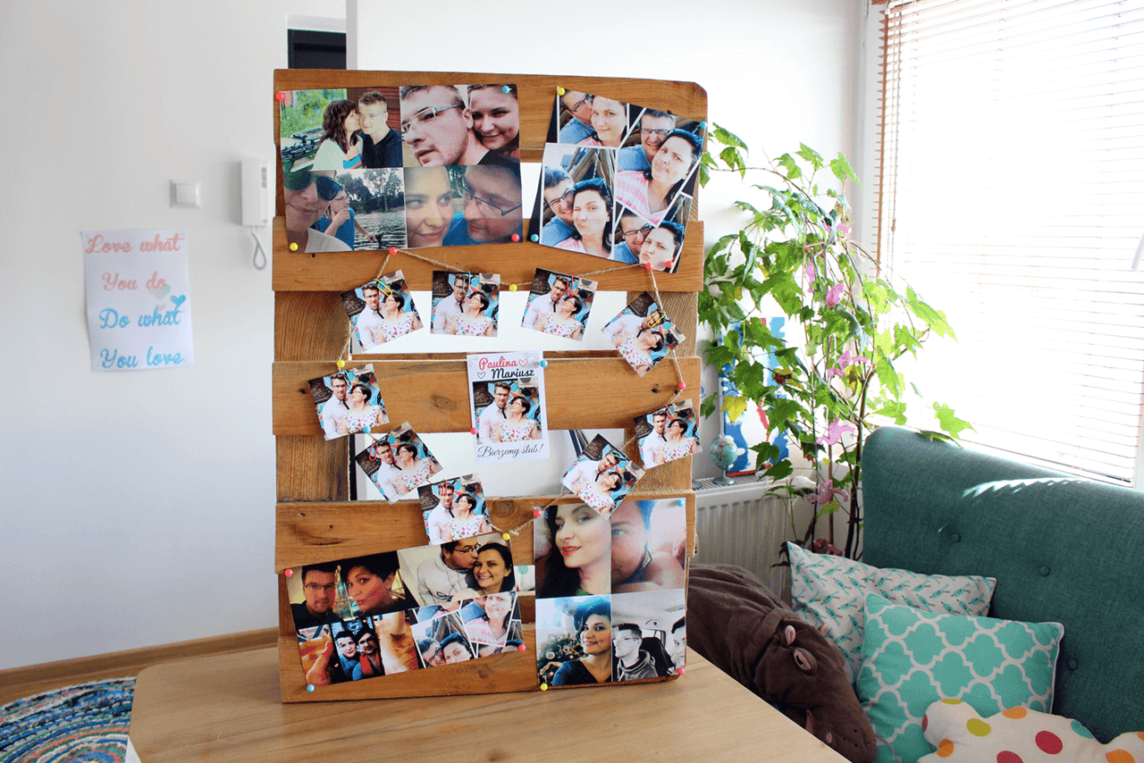 Paleta gotowa, czas na ozdabianie. Naszykowałam sobie cztery kolaże z naszych zdjęć. Od pierwszego wspólnego zdjęcia, przez kilka ważnych dla nas wydarzeń. Wyjazdu na Mazury, gdzie Mariusz wyznał mi miłość po raz pierwszy, wejścia do mieszkania po remoncie- więcej o nich opowiadam na video 😉 Kolaże umiejscowiłam w czterech rogach palety 🙂