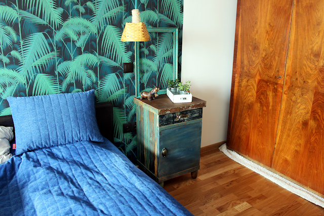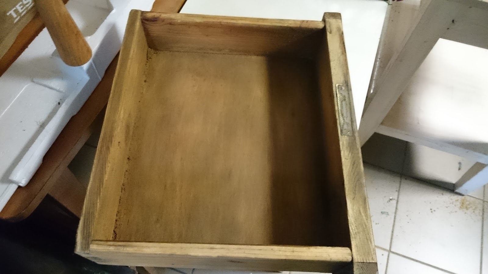 Mebel w całości „rozebrałam”, wykręciłam nogi-beczułki, wyjęłam szufladę, wykręciłam stare zawiasy i zdjęłam drzwiczki. Cały mebel musiałam przeszlifować, zanim cokolwiek dałoby się na niego położyć. Szpachelką odrywałam elementy, które i tak same odpadały, później szlifowałam, szlifowałam, szlifowałam. Brakowało blatu (był zakryty ceratą i pinezkami- stara szkoła), więc powyciągałam wystające gwoździe i kupiłam sklejkę pod nowy blat.