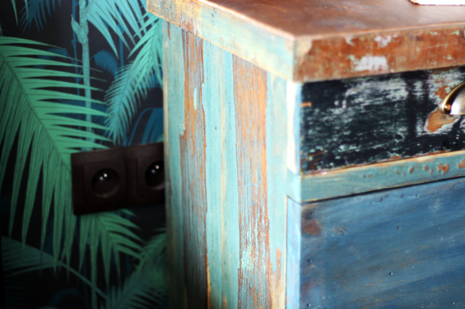 W trakcie prac przy korpusie szafki, głównie na bokach, spod farby zaczęło wyjawiać się coś takiego. Coś tak cudownego! Kiedy już nic nie odpryskiwało- zostało do równości wyszlifowane, plamy zeszły, postanowiłam te piękne boki tylko zawoskować.
