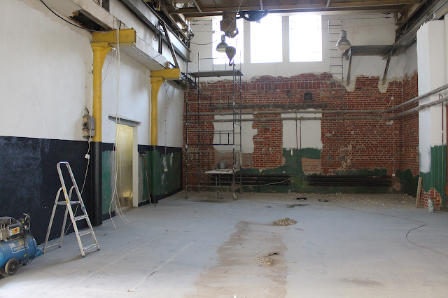 Po rozebraniu ścianek, do lokalu wpada znacznie więcej światła. Ale nie tylko rozbiorem ścianek, chciałyśmy je pozyskać. Pierwsze to oczywiście: elektryka, czyli położenie jej na nowo. Stare, postindustrialne lampy chciałyśmy zachować, a przynajmniej ich oprawy, natomiast do środka, lampy dostały nowe bebechy, i nowe, energooszczędne żarówki. Lokal zyskał też bardzo wiele światła, dzięki doborowi odpowiedniej kolorystyki. Do samego sklepienia dachu, na którym odkryto stare deski <3 (!), ściany są pomalowane na biało. Zaś lamperia, dostała piękny, ciemno granatowy kolor. Dla przełamania, filary będą soczyście żółte.