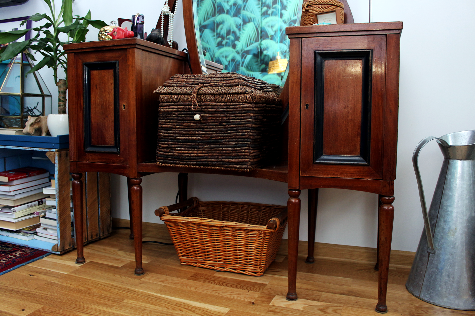 Jak w tytule posta- jak łączyć stare z nowym? Ja robię to naturalnie. Nie boję się tego, że retro toaletka stoi obok skrzynki, czyli półki na książki 😉
