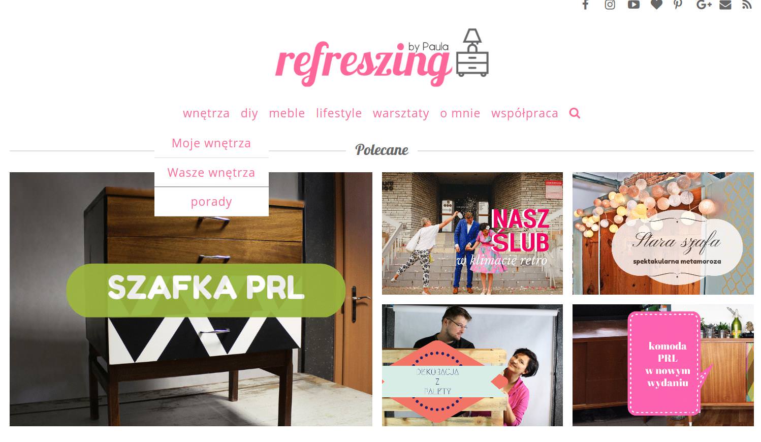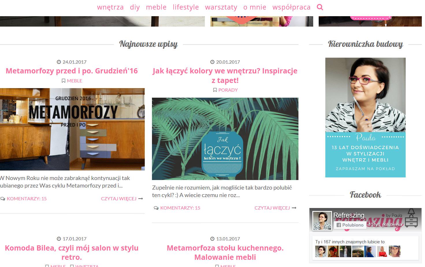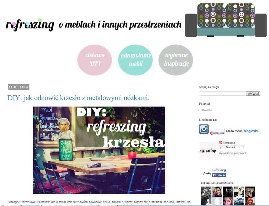 Ten etap był ważny. Jasno podzieliłam bloga na trzy tematy, które na nim poruszam, wnętrza, projekty DIY i meble. Z biegiem czasu, wszystko ewoluowało. Był moment kiedy więcej było DIY, za chwilę zaś wnętrz, a teraz np. meble wiodą prym. W tamtej chwili też pokochałam font (czcionkę) dla samej nazwy refreszing, która w zmienianej postaci, towarzyszy mi do dziś 🙂