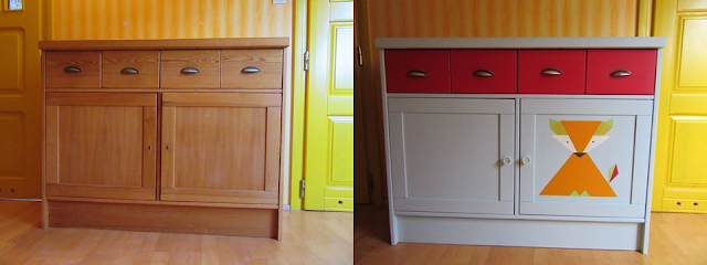 Ten mebel przed miał swój urok. Ale stworzenie z niego mebla do pokoju dziecięcego w tak przemyślanym wydaniu mnie zachwyciło. Ta czerwień i szarość plus lisek- bomba <3!