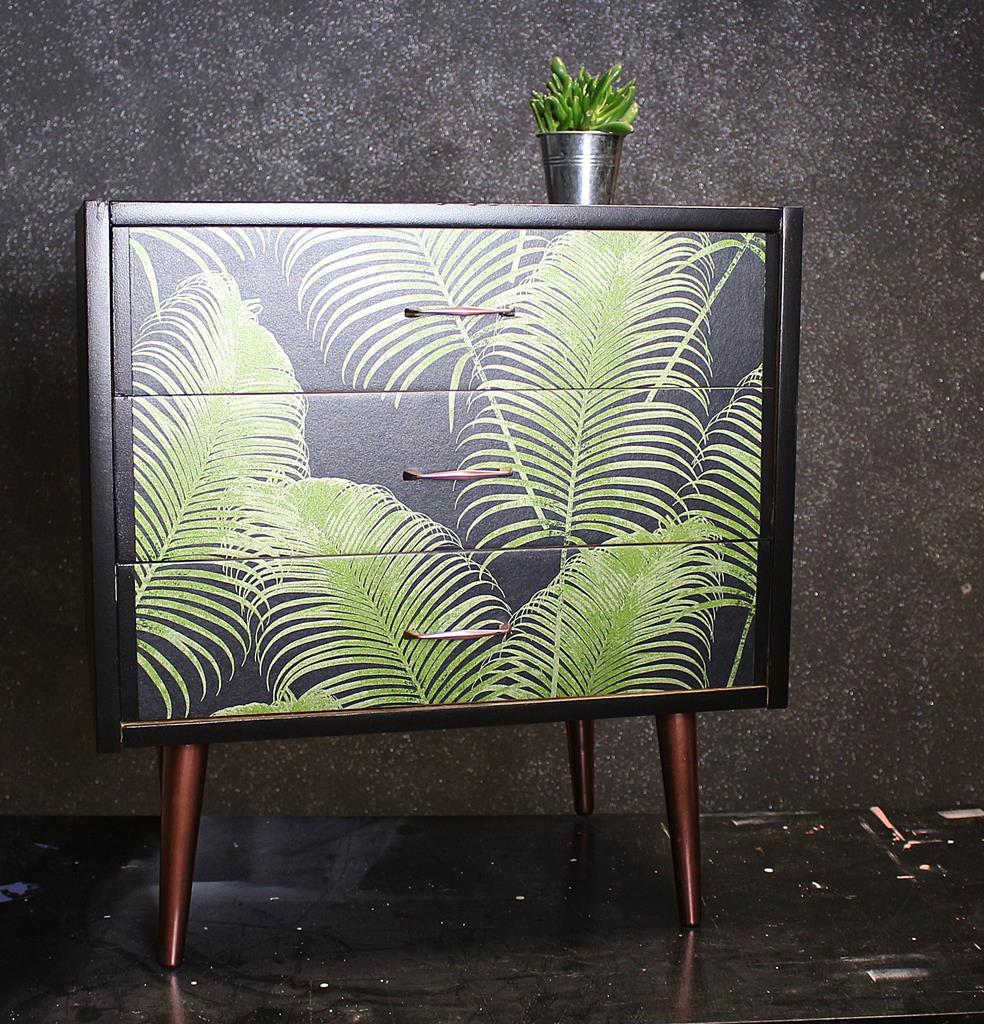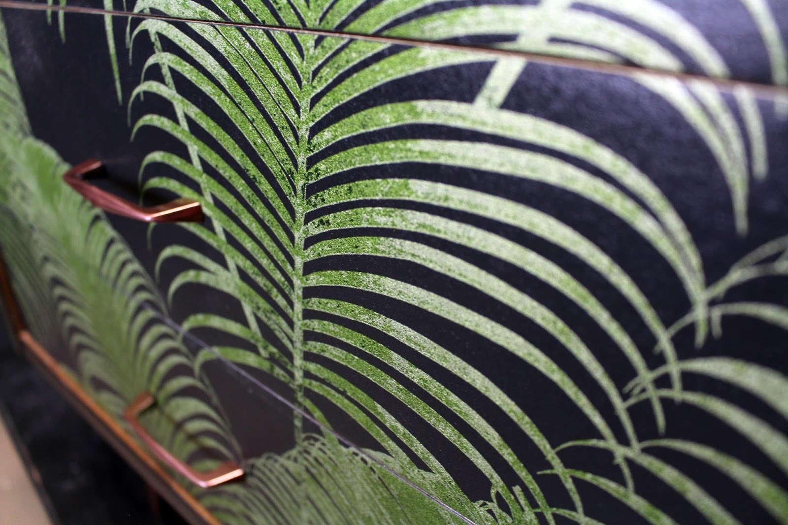 Dla szuflad, koncepcja na użycie tapety była od początku. Wybrałam przepiękny wzór (więcej tapet znajdziecie na tapety-sklep.com) z motywem liści paproci. Na czarnym tle, cudowna zieleń, z mieniącym się brokatem.. WOW! Ponieważ szerokość tapety, dosłownie o 2cm nie wystarczała na zakrycie wysokiego połysku, zrobiłam szufladom proste, czarne lamówki.