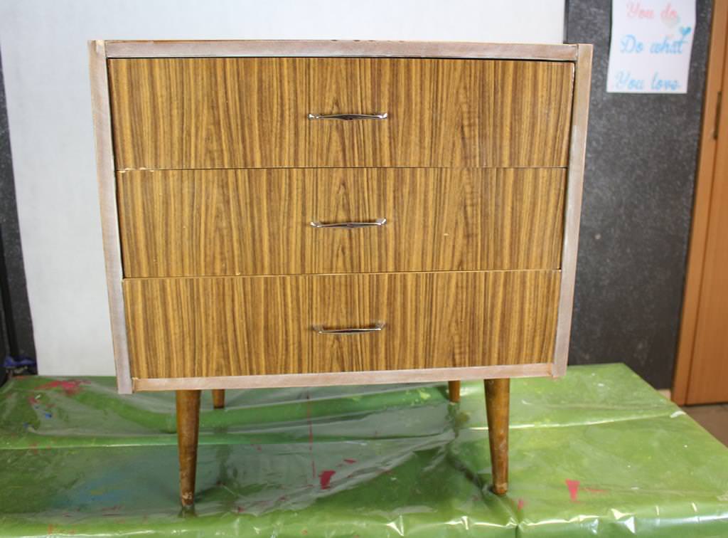 z szufladami. Oczywiście, oryginalnie, ten mebelek nie był taki lekki. Miał wysoką, pionową nadstawkę. Dopiero po jej zdjęciu zyskał „współczesnego sznytu”. Przyznajcie sami, że ani kolor, ani fornir nie zachwycają. Będzie więc metamorfoza totalna! Ale w nowym dla mnie wydaniu 🙂