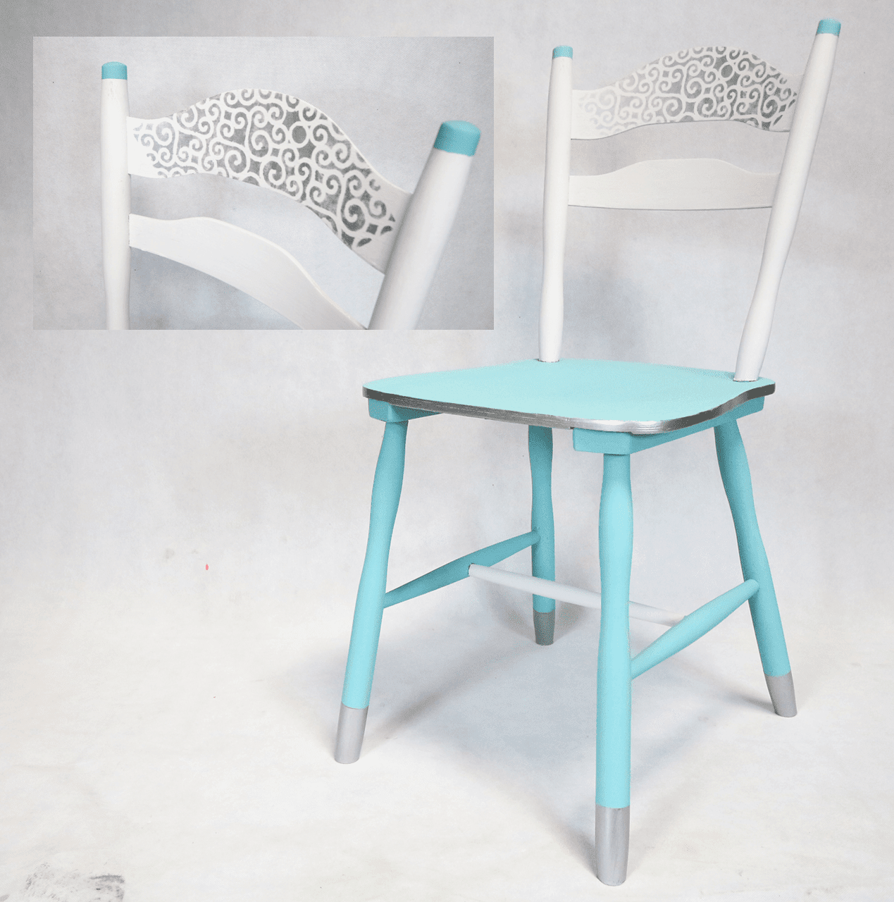 Do stylizacji krzeseł używałyśmy taśm oraz szablonów dekoracyjnych (wielokrotnego użytku) od Hagart.