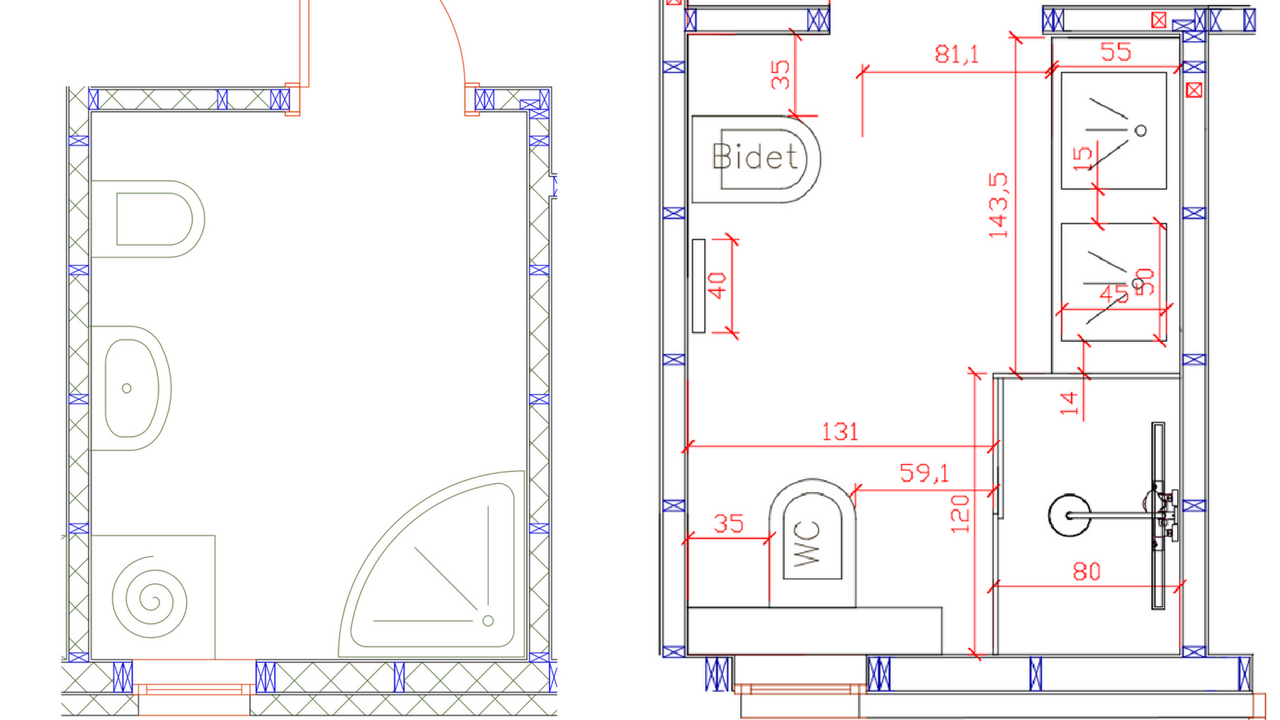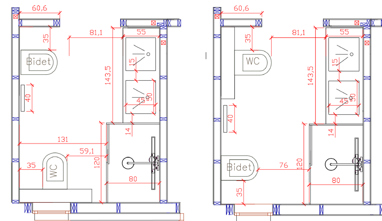 Nie zmieniałyśmy umiejscowienia prysznica, ale zdecydowałyśmy się powiększyć go – teraz jest on prostokątem o wymiarach 120x80cm. Zaraz obok niego zaplanowałyśmy dużą szafkę z dwiema umywalkami ( zgodnie z wymaganiami Pauli), a naprzeciwko niej – bidet. Miska ustępowa znalazła swoje miejsce na krótszej ścianie toalety, zaraz obok prysznica.