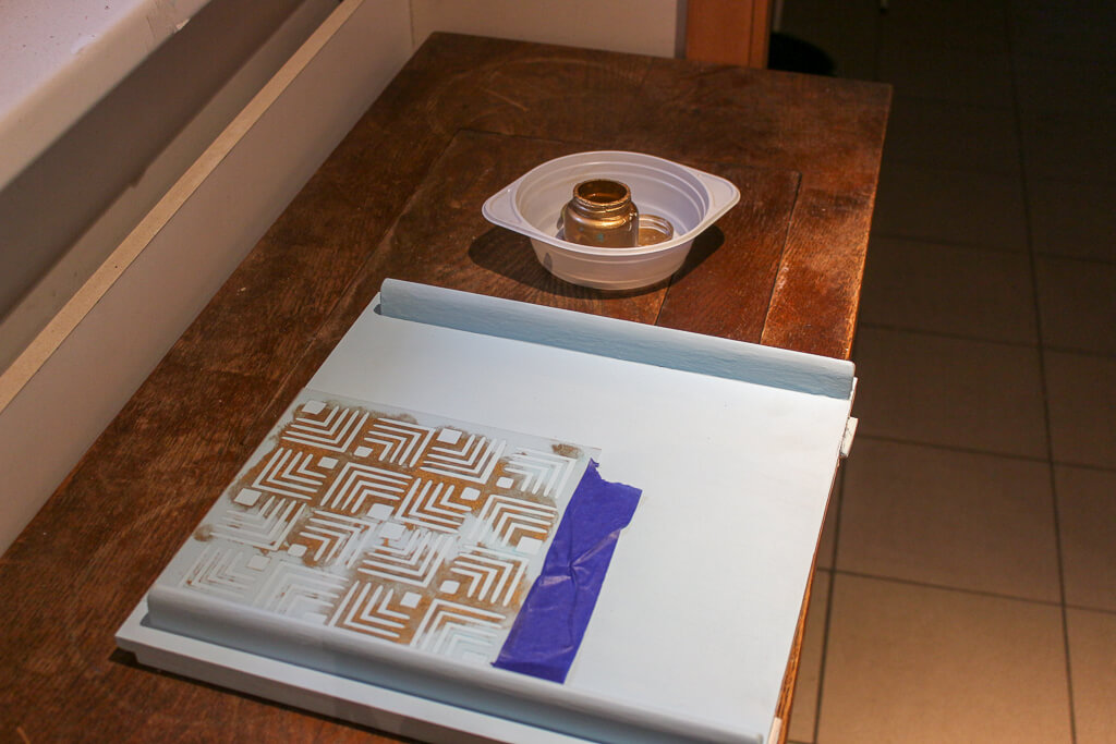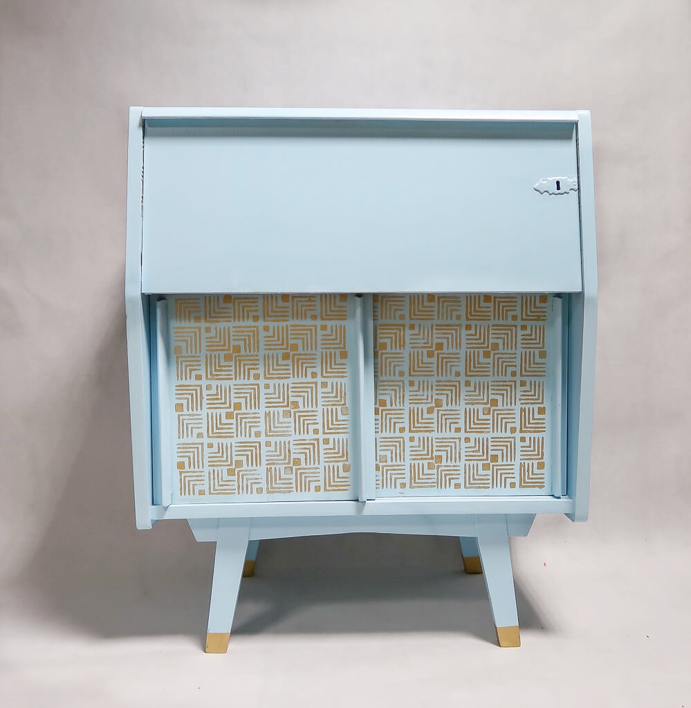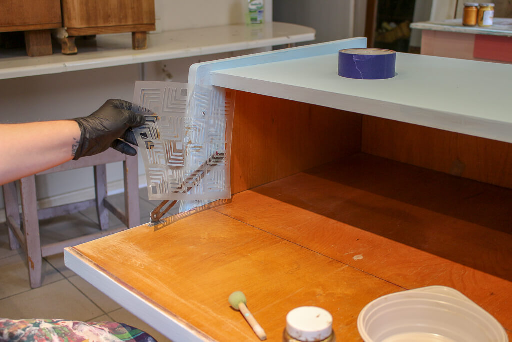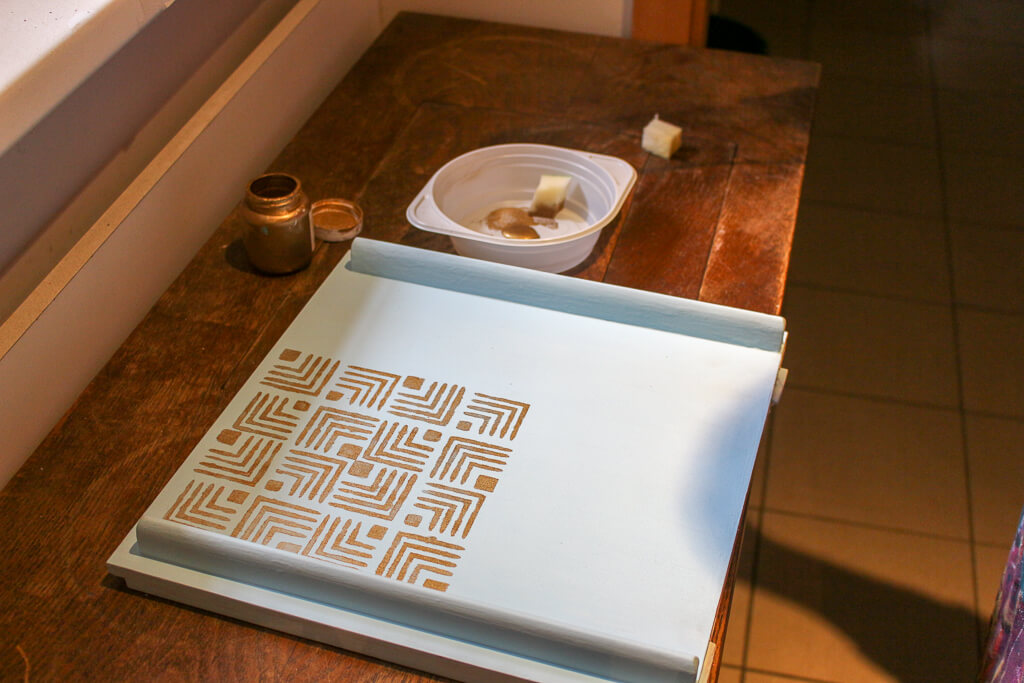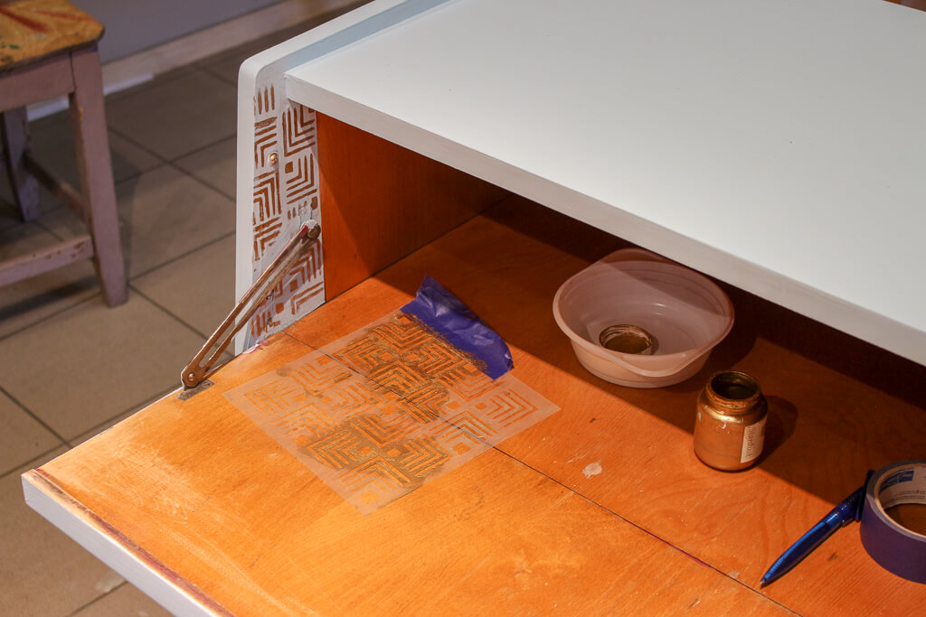 Dekor postanowiłam zrobić również wewnątrz szafki. W środku, w jednym miejscu, bardzo widocznym po otwarciu. Użyłam szablonu w geometryczny wzór, złotej farby i pędzla typu gąbka.