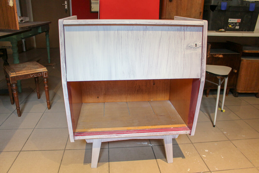 Jak widzicie mocno wyszlifowałam mebel, później pokryłam go farbą podkładową i na koniec borówkową farbą. I tak komódka służyła mi kilka lat w naszej sypialni w mieszkaniu. Po jakiś czasie kolor mi zbrzydł, a komoda odstała swoje w pracowni, czekając na pomysł i lepsze czasy. W końcu nadeszły!