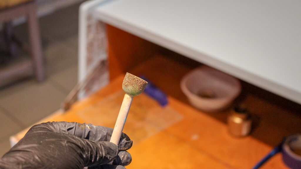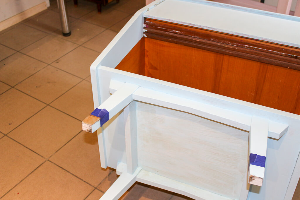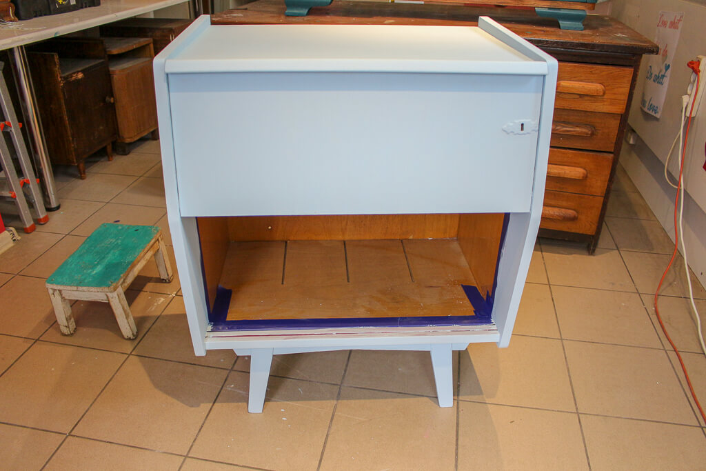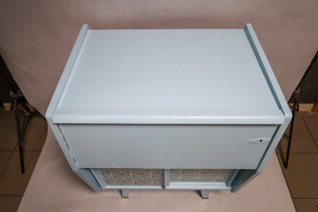 Zanim przystąpiłam do wykonania dekoru, przed malowaniem na jasny niebieski, musiałam usunąć zacieki i grubą warstwę borówkowej farby z rantów, bo drzwiczki nie przesuwałyby się. Użyłam ostrza, którym szybko pozbyłam się nadmiaru farb.