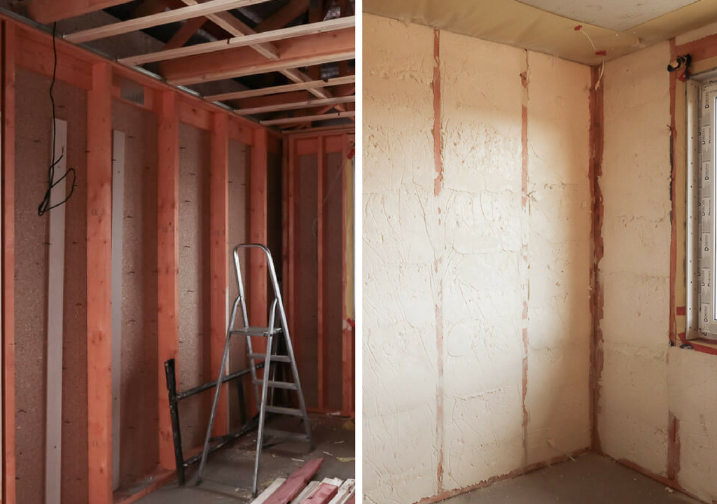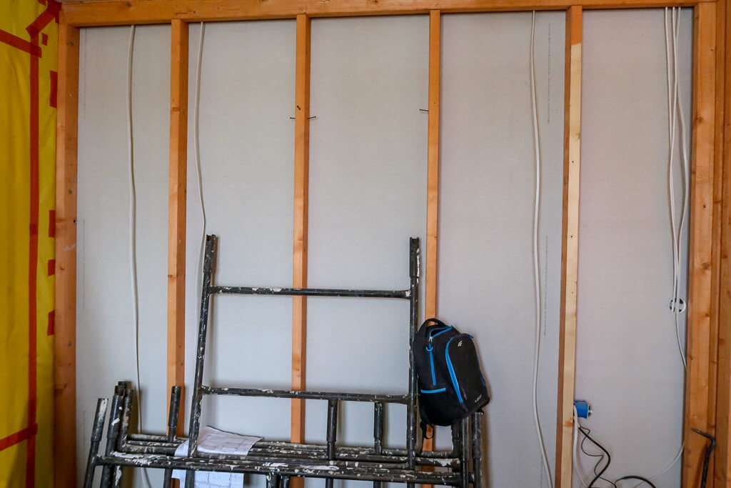 Po ułożeniu wełny, montowane są płyty fermacell. W przekroju ściany wewnętrznej domu mamy więc: płytę fermacell, szkielet drewniany, wypełnienie wełną, płyta fermacell.