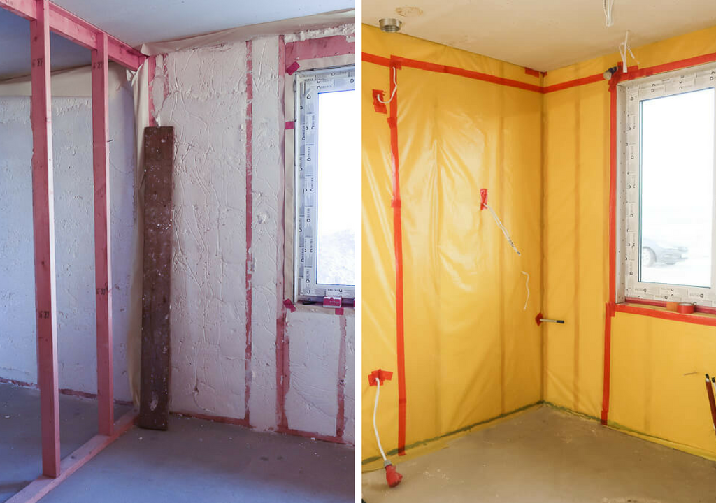 Wszystkie ściany elewacyjne domu zostały ocieplone pianką. Po jej utwardzeniu pokryto ją żółtą folią paroizolacyjną, zaś elementy łączeń folii zabezpieczony czerwoną taśmą. Dzięki czemu unikamy mostków termicznych.
