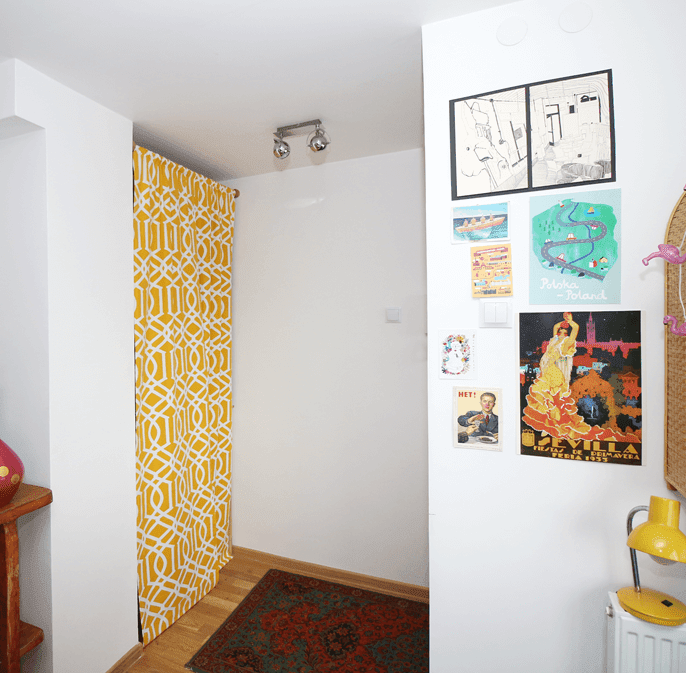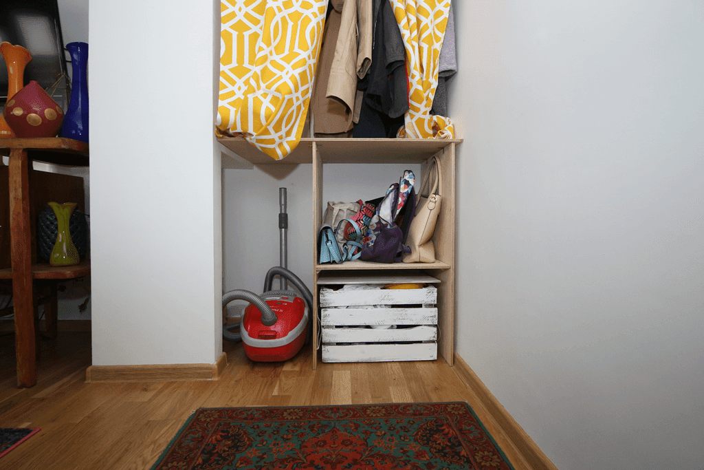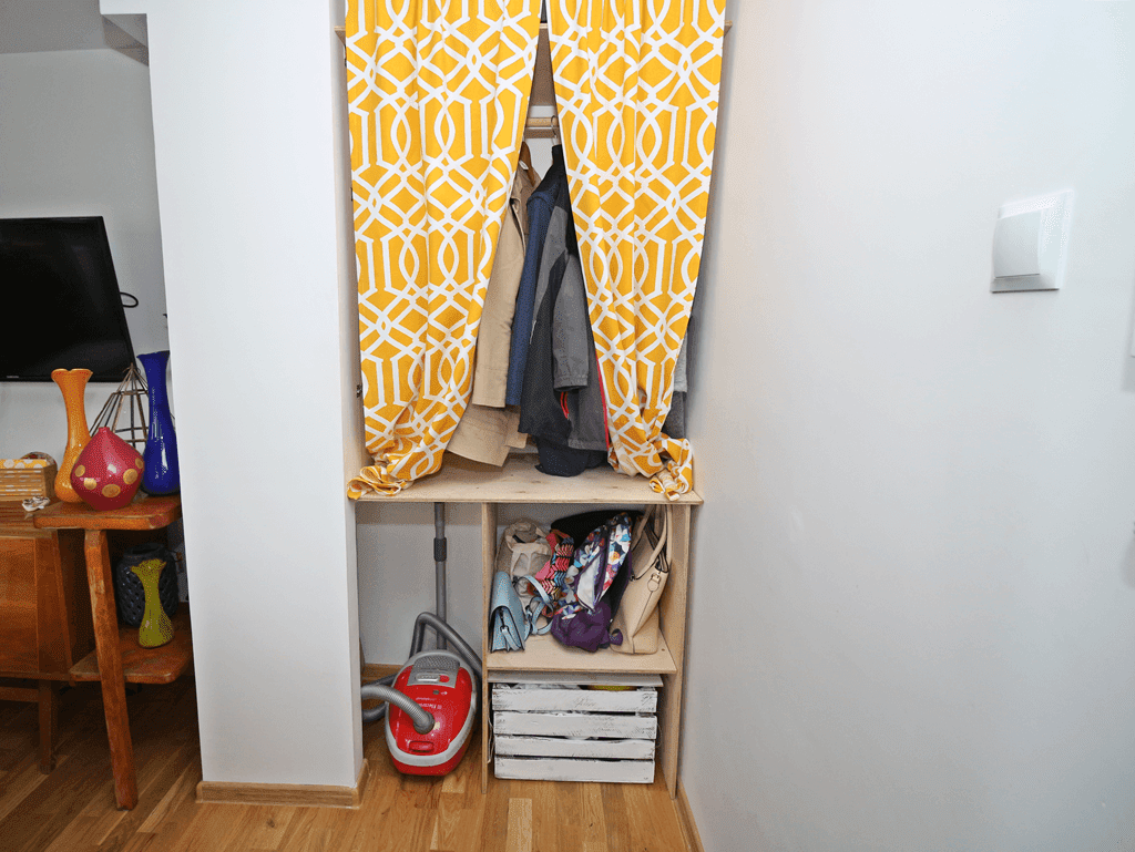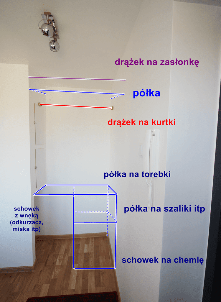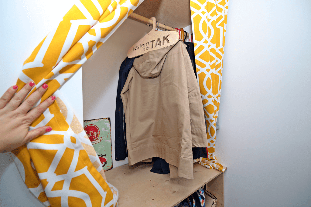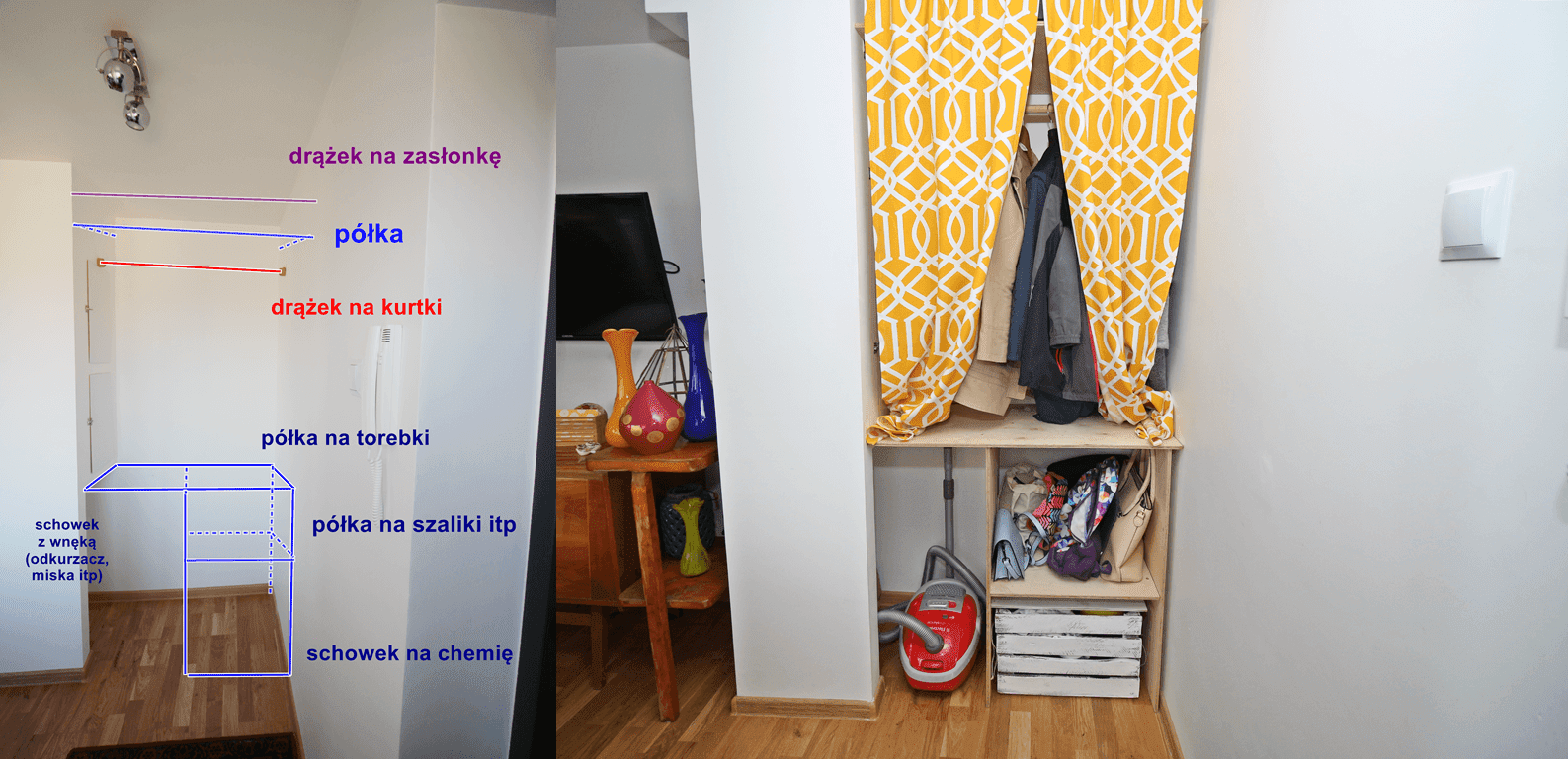 Tutaj jeszcze widok z saloniku i kilka słów podsumowania. Koszt całego projektu wyniósł ok 260zł. Elementy sklejki, kątowniki, wkręty, drążki, mocowanie drążków, płyty do maskowania liczników. Kotara, a właściwie dwie kotarki pochodzą z Dekorii. Myślałam o tym aby powiesić je w saloniku,ale tutaj sprawdzają się świetnie. Uwagi ode mnie: wybierajcie grubą sklejkę, na tyle grubą, aby wwiercić się wkrętem. Poza tym jej grubość zapewni stabilność i sklejka nie będzie się uginać. Drążek drewniany z powodzeniem utrzymuje ciężar 8-10 kurtek, ale jeśli boicie się obciążenia, to kupcie drążek metalowy. Rozrysujcie sobie plan WASZEJ szafy, biorąc pod uwagę wiele zmiennych- głębokość, odstępy między półkami. Sklejki w żaden dodatkowy sposób nie impregnowaliśmy. Nie ma żadnych drzazg ani innych defektów. Mogłaby być pomalowana, nie była taka szorstka, ale z drugiej strony to właściwie w żaden sposób nie wpływa na użytkowanie. Dla porównania dodam, iż szafa na wymiar (z MDF), w to miejsce po wycenie wyniosłaby nas ok. 1800zł.