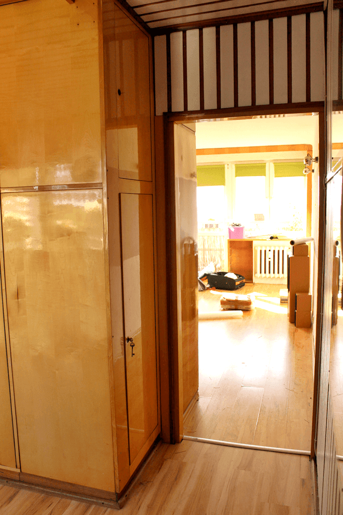 Naglił nas czas oraz wykorzystany budżet. Mariusz myślał o zakupie szafy i wstawieniu jej we wnękę. Ja myślałam- czemu nie zrobić prostej zabudowy ze sklejki?