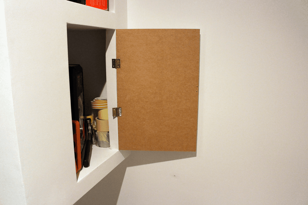 Tutaj mierzyłam półki (na czas mierzenia przykleiłam zawiasy klejem na gorąco), było mi łatwiej wywiercić otwory w karton gipsie pod zawiasy. Później przykleiłam listewkę, w nią nawierciłam zawiasy.