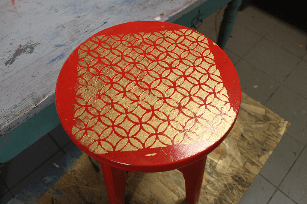 Po uzyskaniu jednolitej czerwienie postanowiłam siedzisko taboretu przyozdobić szablonem. Z początku sięgnęłam po koniczynę marokańską, ale byłoby jej zdecydowanie za dużo. Wybrałam więc wzór geometryczny, który z pozoru nie pasuje do wschodniego stylu, ale po skończonej pracy- wpasował się idealnie!