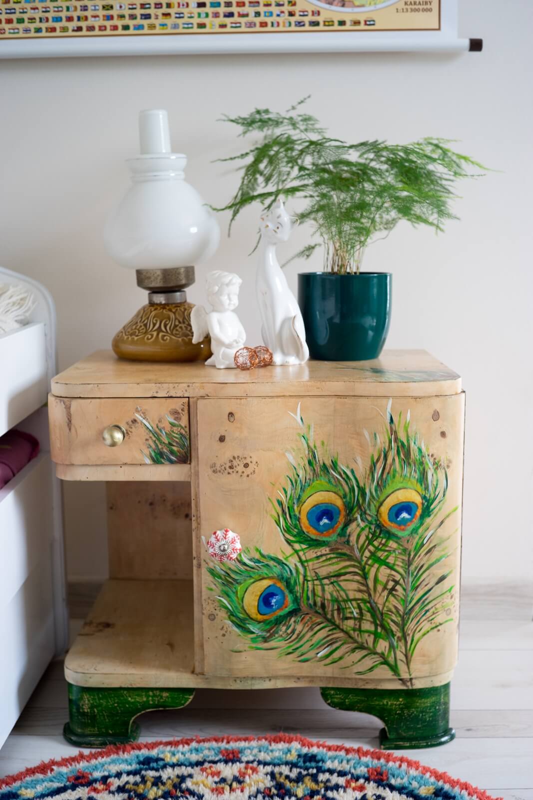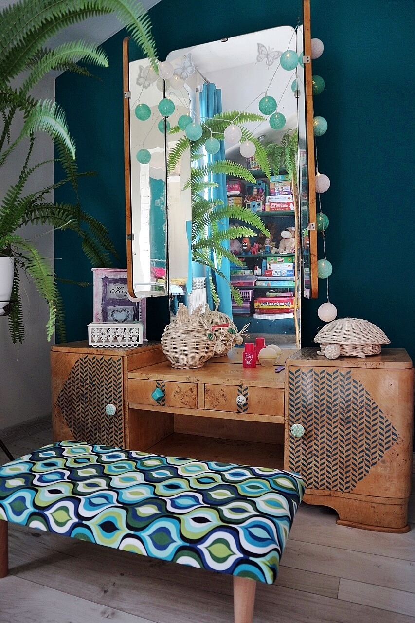 Autorka dopieszcza cały dom! Pokój jej córki jest dla mnie po prostu szałowy! Piękny turkus na ścianie i kolorowe meble. Czy wiecie, że są one ręcznie malowane? Te pawie oczka i flamingi na szafie? Marta ma wielki talent do rysowania i malowania, właśnie. Uważam,  że to ją wyróżnia pośród innych refreszerek i powinna ten talent wykorzystać!